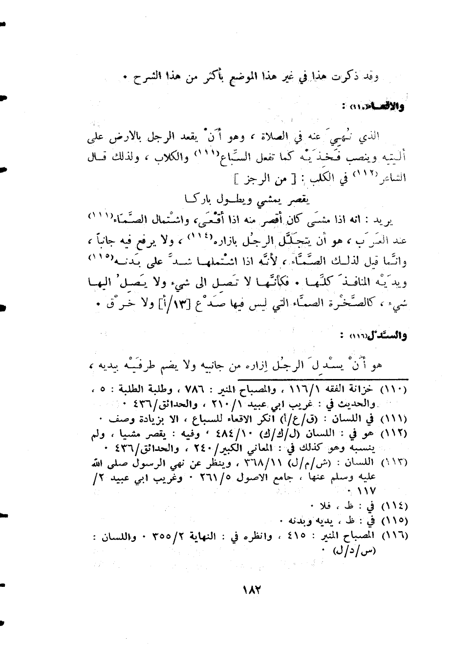 الَّذِي نهي عَنهُ فِي الصَّلَاة وَهُوَ أَن يقْعد الرجل بِالْأَرْضِ على أليتيه وَينصب فَخذيهِ كَمَا تفعل السبَاع وَالْكلاب وَلذَلِك قَالَ الشَّاعِر فِي الْكَلْب [من الرجز] ... يقصر يمشي وَيطول باركا ...