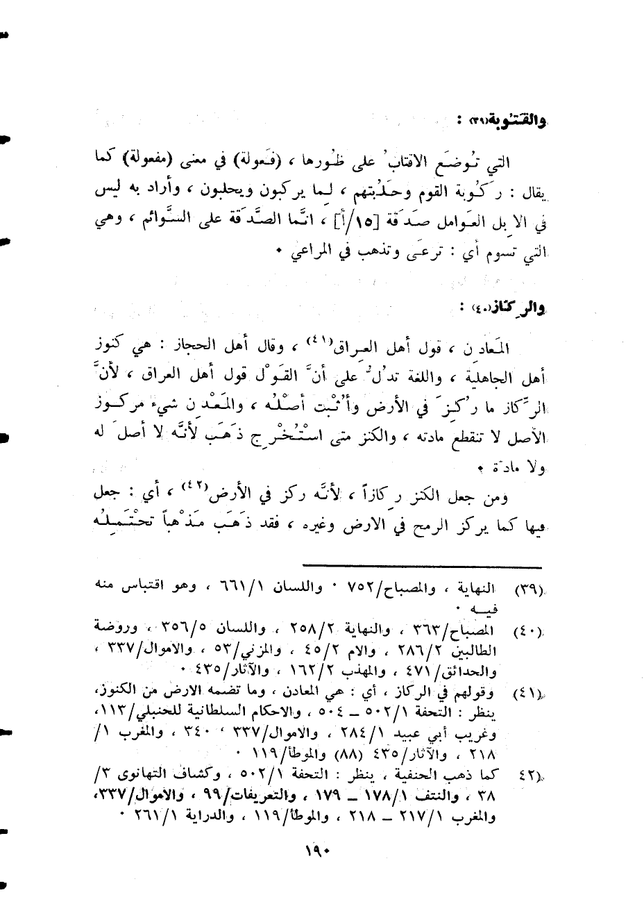 الْمَعَادِن قَول أهل الْعرَاق وَقَالَ أهل الْحجاز هِيَ كنوز أهل الْجَاهِلِيَّة واللغة تدل على أَن القَوْل قَول أهل الْعرَاق لِأَن الرِّكَاز مَا ركز فِي الأَرْض وَأثبت أَصله والمعدن شَيْء مركوز الأَصْل لَا تَنْقَطِع مادته والكنز مَتى استخرج ذهب لِأَنَّهُ لَا أصل لَهُ وَلَا مَادَّة.