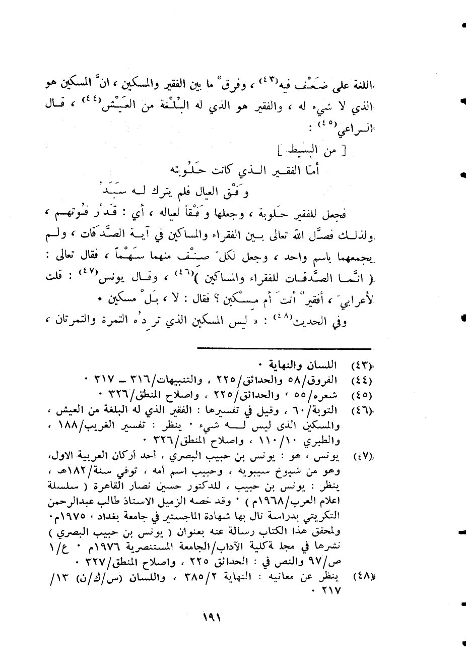 اللُّغَة على ضعف فِيهِ وَفرق مَا بَين الْفَقِير والمسكين إِن الْمِسْكِين هُوَ الَّذِي لَا شَيْء لَهُ وَالْفَقِير هُوَ الَّذِي لَهُ الْبلْغَة من الْعَيْش قَالَ الرَّاعِي [من الْبَسِيط] ... أما الْفَقِير الَّذِي كَانَت حلوبته ... وفْق الْعِيَال فَلم يتْرك لَهُ سبد ...