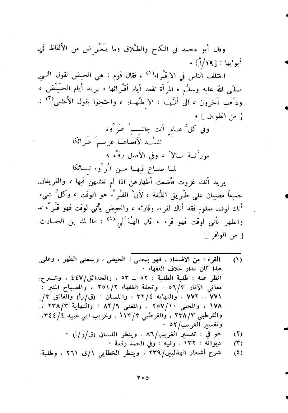 اخْتلف النَّاس فِي الإقراء فَقَالَ قوم هِيَ الْحيض لقَوْل النَّبِي صلى الله عَلَيْهِ وَسلم الْمَرْأَة تقعد أَيَّام أقرائها يُرِيد أَيَّام الْحيض وَذهب آخَرُونَ إِلَى أَنَّهَا الإطهار وَاحْتَجُّوا بقول الْأَعْشَى [من الطَّوِيل] ... وَفِي كل عَام أَنْت جاشم غَزْوَة ... تشد لأقصاها عزيم عزائكا