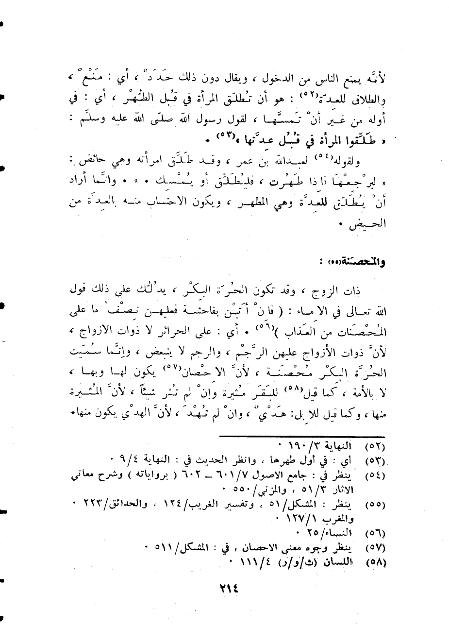 ذَات الزَّوْج وَقد تكون الْحرَّة الْبكر يدلك على ذَلِك قَول الله تَعَالَى فِي الْإِمَاء: {فَإِن أتين بِفَاحِشَة فعليهن نصف مَا على الْمُحْصنَات من الْعَذَاب} أَي على الْحَرَائِر لَا ذَوَات الْأزْوَاج لِأَن ذَوَات الْأزْوَاج عَلَيْهِنَّ الرَّجْم وَالرَّجم لَا يَتَبَعَّض وَإِنَّمَا سميت الْحرَّة الْبكر مُحصنَة لِأَن الْإِحْصَان يكون لَهَا وَبهَا لَا بالأمة كَمَا قيل للبقر مثيرة وَإِن لم تثر شَيْئا لِأَن المثيرة مِنْهَا وكما قيل لِلْإِبِلِ هدي وَإِن لم تهد لِأَن الْهَدْي يكون مِنْهَا.