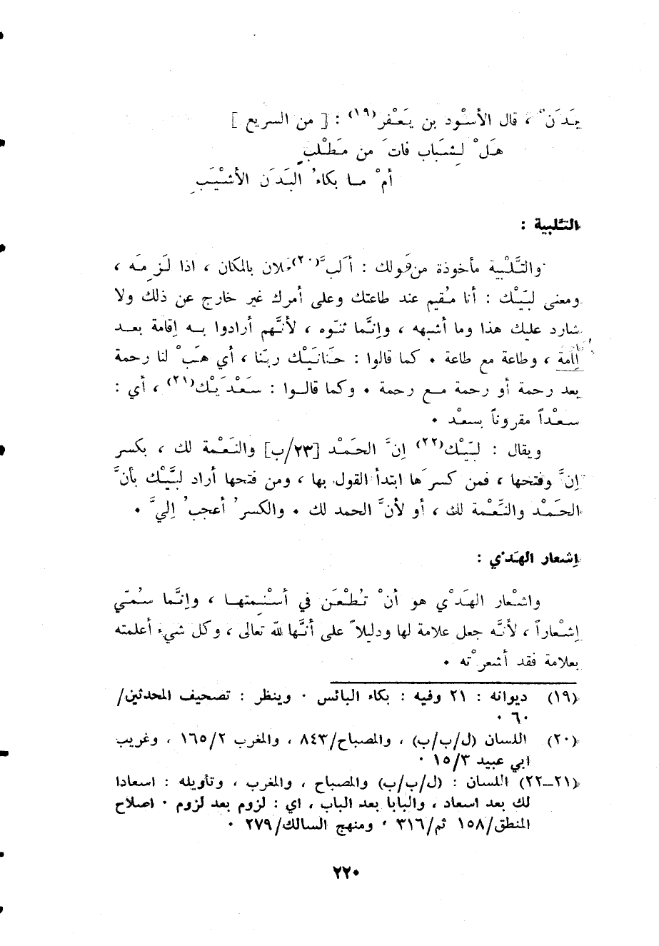 والتلبية مَأْخُوذَة من وَلَك ألب فلَان بِالْمَكَانِ إِذا لزمَه وَمعنى لبيْك أَنا مُقيم عِنْد طَاعَتك وعَلى أَمرك غير خَارج عَن ذَلِك وَلَا شارد عَلَيْك هَذَا وَمَا أشبهه وَإِنَّمَا ثنوه لأَنهم أَرَادوا بِهِ إِقَامَة بعد إِقَامَة وَطَاعَة مَعَ طَاعَة كَمَا قَالُوا حنانيك رَبنَا أَي هَب لنا رَحْمَة بعد رَحْمَة أَو رَحْمَة مَعَ رَحْمَة وكما قَالُوا سعديك أَي سَعْدا مَقْرُونا بِسَعْد.