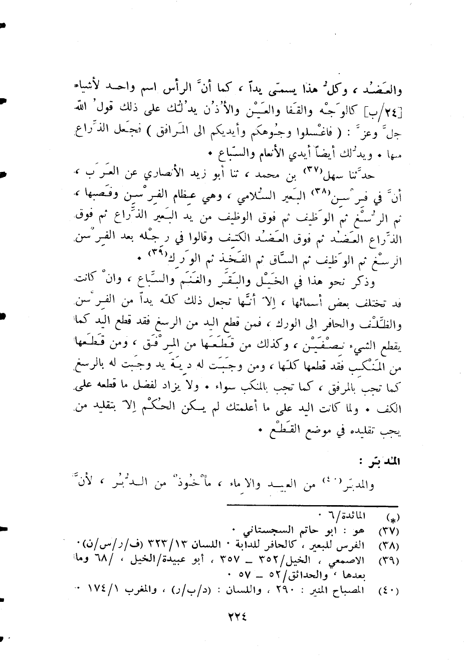 وَذكر نَحْو هَذَا فِي الْخَيل وَالْبَقر وَالْغنم وَالسِّبَاع وَإِن كَانَت قد تخْتَلف بعض أسمائها إِلَّا أَنَّهَا تجْعَل ذَلِك كُله يدا من الفرسن والظلف والحافر إِلَى الورك فَمن قطع الْيَد من الرسغ فقد قطع الْيَد كَمَا يقطع الشَّيْء نِصْفَيْنِ وَكَذَلِكَ من قطعهامن الْمرْفق وَمن قطعهَا من الْمنْكب فقد قطعهَا كلهَا وَمن وَجَبت لَهُ دِيَة يَد وَجَبت لَهُ بالرسغ كَمَا تجب بالمرفق كَمَا تجب بالمنكب سَوَاء وَلَا يُزَاد لفضل مَا قطعه على الْكَفّ وَلما كَانَت الْيَد على مَا أعلمتك لم يكن الحكم إِلَّا بتقليد من يجب تَقْلِيده فِي مَوضِع الْقطع.