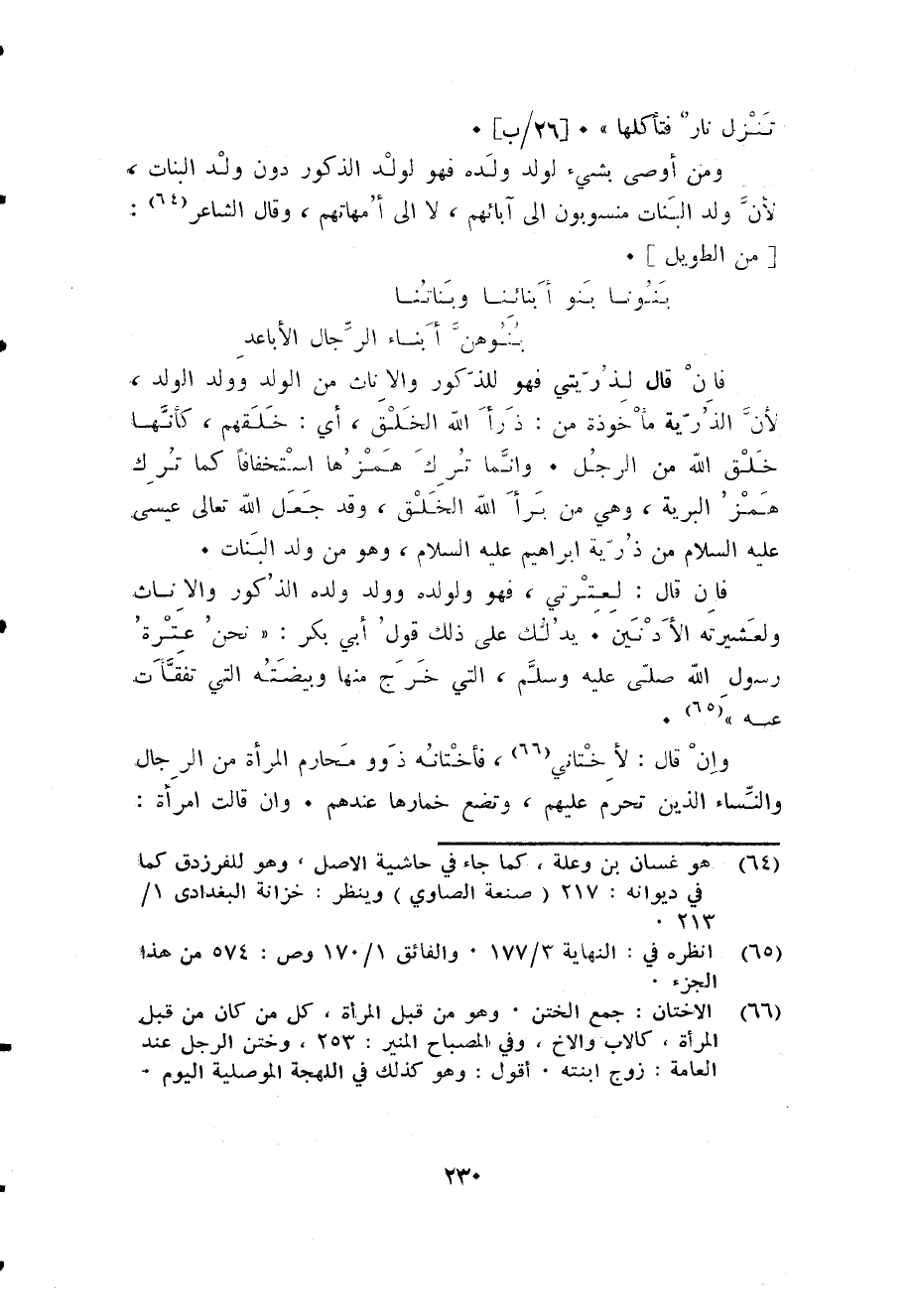 فان قَالَ لعترتي فَهُوَ ولولده وَولد وَلَده الذُّكُور والاناث ولعشيرته الأدنين يدلك على ذَلِك قَول أبي بكر: نَحن عترة رَسُول الله صلى الله عَلَيْهِ وَسلم الَّتِي خرج مِنْهَا وبيضته الَّتِي تفقات عَنهُ.