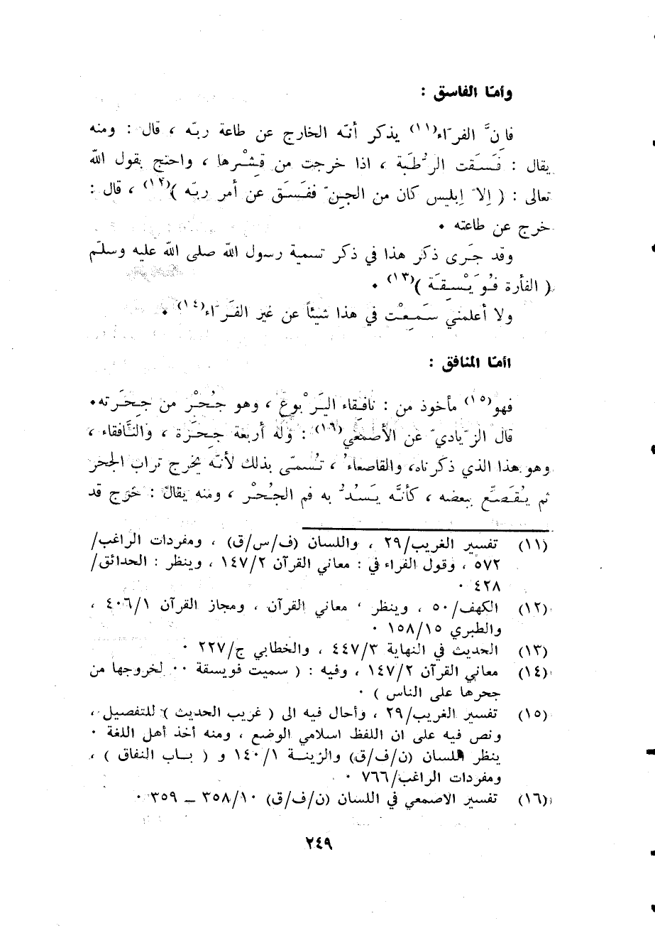 فَإِن الْفراء يذكر أَنه الْخَارِج عَن طَاعَة ربه قَالَ وَمِنْه يُقَال فسقت الرّطبَة إِذا خرجت من قشرها وَاحْتج بقول الله تَعَالَى {إِلَّا إِبْلِيس كَانَ من الْجِنّ ففسق عَن أَمر ربه} قَالَ خرج عَن طَاعَته