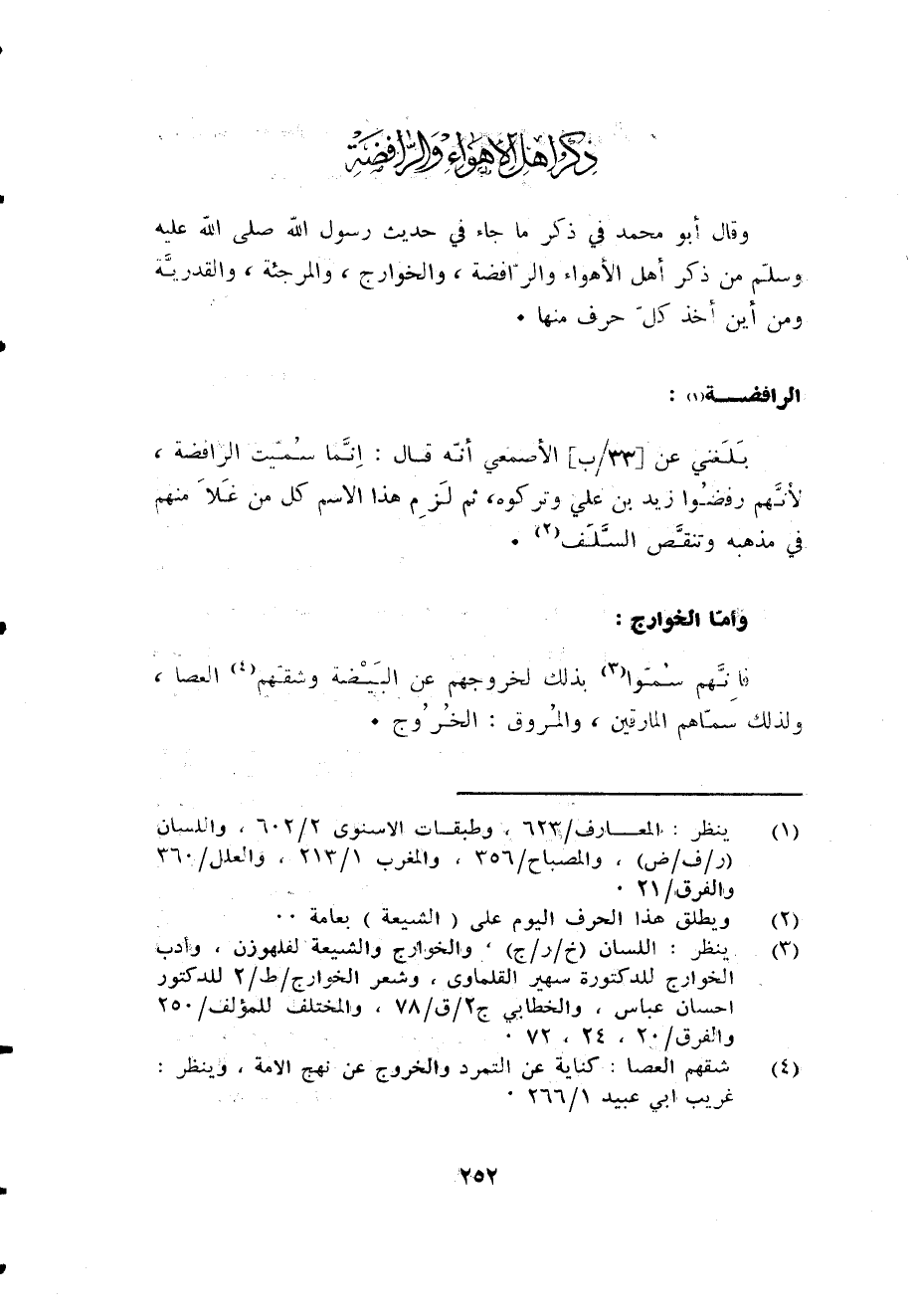 وَقَالَ أَبُو مُحَمَّد فِي ذكر ماجاء فِي حَدِيث رَسُول الله صلى الله عَلَيْهِ وَسلم من ذكر أهل الْأَهْوَاء والرافضة والخوارج والمرجئة والقدرية وَمن أَيْن أَخذ كل حرف مِنْهَا