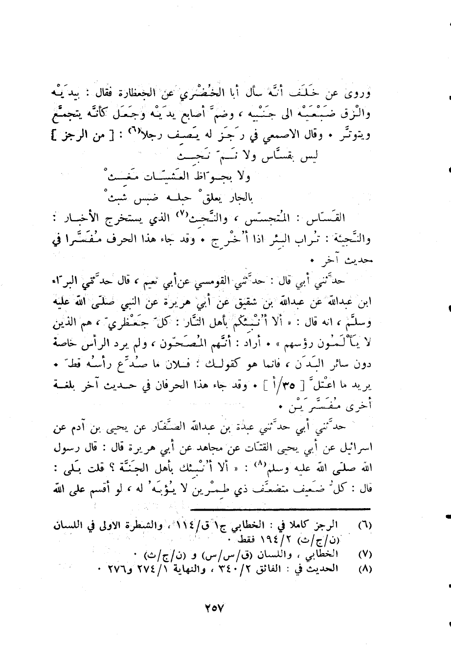 القساس المتجسس والنجث الَّذِي يسْتَخْرج الْأَخْبَار والنجيثة تُرَاب الْبِئْر إِذا أخرج وَقد جَاءَ هَذَا الْحَرْف مُفَسرًا فِي حَدِيث آخر