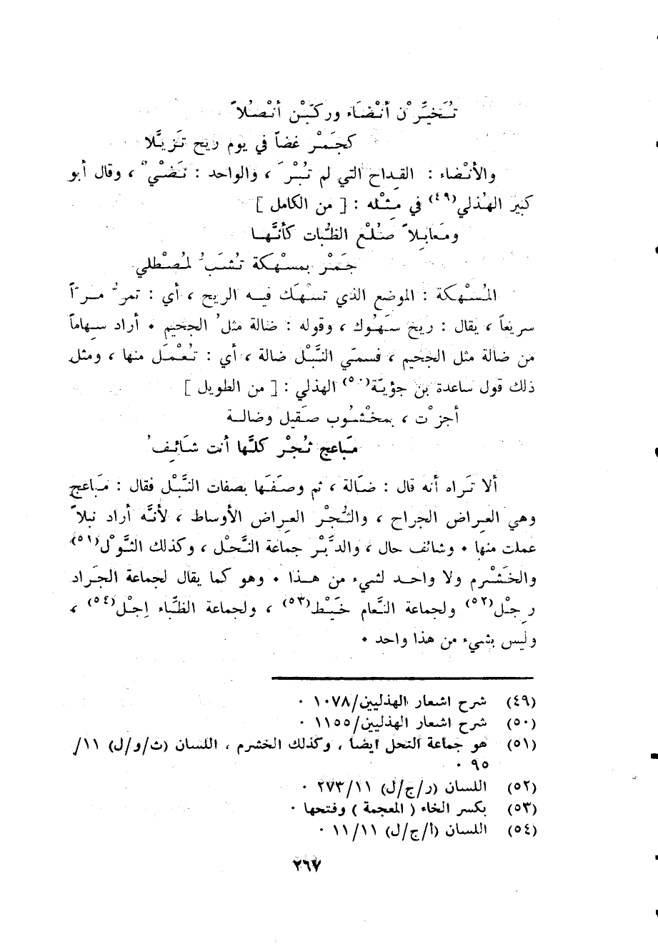 أَلا ترَاهُ أَنه قَالَ ضَالَّة ثمَّ وصفهَا بِصِفَات النبل فَقَالَ مباعج وَهِي العراض الْجراح والثجر العراض الأوساط لِأَنَّهُ أَرَادَ نبْلًا عملت مِنْهَا وشائف حَال والدبر جمَاعَة النَّحْل وَكَذَلِكَ الثول والخشرم وَلَا وَاحِد لشَيْء من هَذَا وَهُوَ كَمَا يُقَال لجَماعَة الْجَرَاد رجل ولجماعة النعام خيط ولجماعة الظباء إجل وَلَيْسَ بِشَيْء من هَذَا وَاحِد