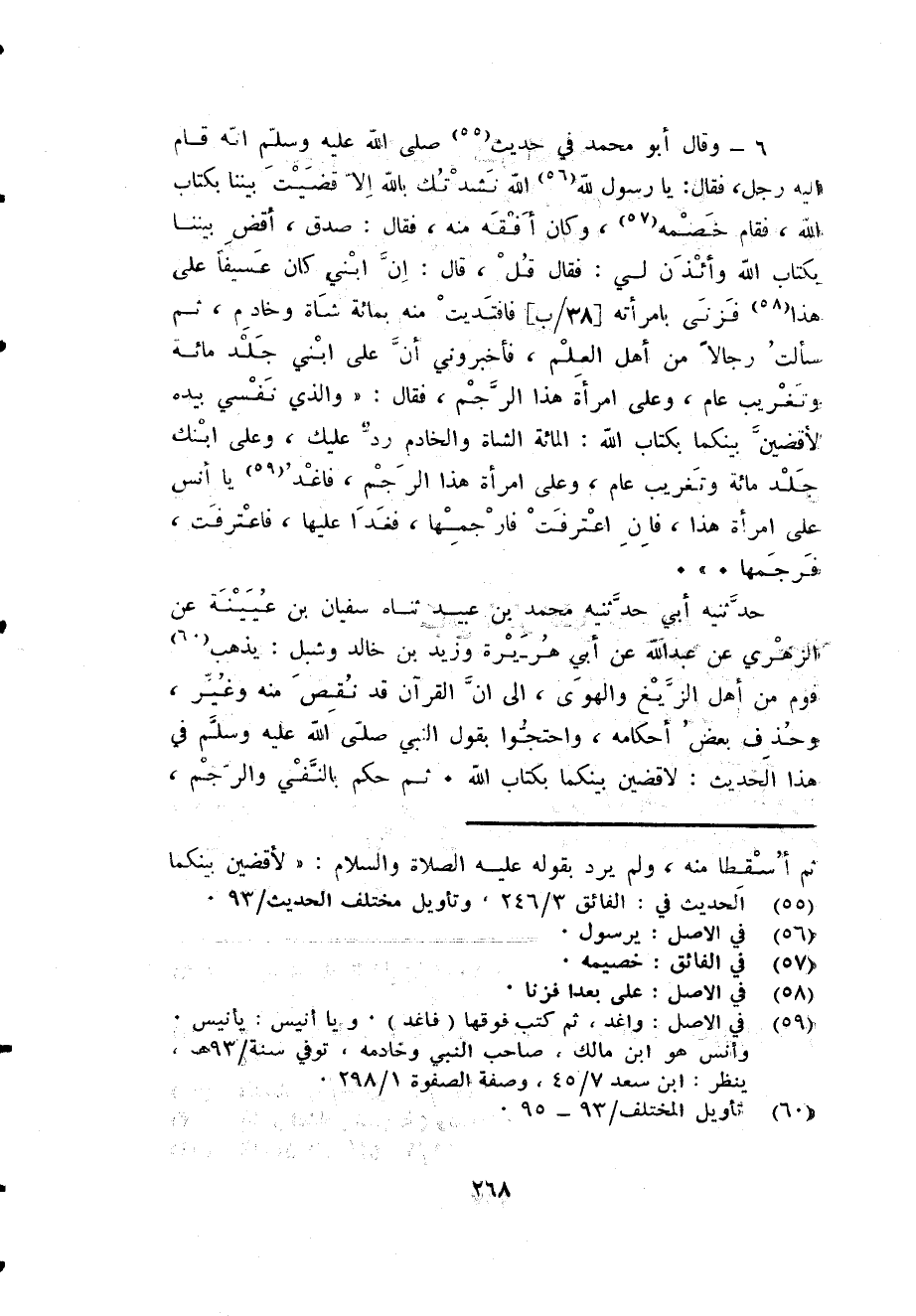6 - وَقَالَ أَبُو مُحَمَّد فِي حَدِيث صلى الله عَلَيْهِ وَسلم أَنه قَامَ إِلَيْهِ رجل فَقَالَ يَا رَسُول الله الله نشدتك بِاللَّه إِلَّا قضيت بَيْننَا بِكِتَاب الله فَقَامَ خَصمه وَكَانَ أفقه مِنْهُ فَقَالَ صدق أقض بَيْننَا بِكِتَاب الله وأئذن لي فَقَالَ قل قَالَ إِن ابْني كَانَ عسيفا على هَذَا فزنى بامرأته [38 / ب] فَافْتَدَيْت مِنْهُ بِمِائَة شَاة وخادم ثمَّ سَأَلت رجَالًا من أهل الْعلم فَأَخْبرُونِي أَن على ابْني جلد مائَة وتغريب عَام وعَلى امْرَأَة هَذَا الرَّجْم فَقَالَ وَالَّذِي نَفسِي بِيَدِهِ لأقضين بَيْنكُمَا بِكِتَاب الله الْمِائَة الشَّاة وَالْخَادِم رد عَلَيْك وعَلى ابْنك جلد مائَة وتغريب عَام وعَلى امْرَأَة هَذَا الرَّجْم فاغد يَا أنس على امْرَأَة هَذَا فَإِن اعْترفت فارجمها فغدا عَلَيْهَا فَاعْترفت فرجمها