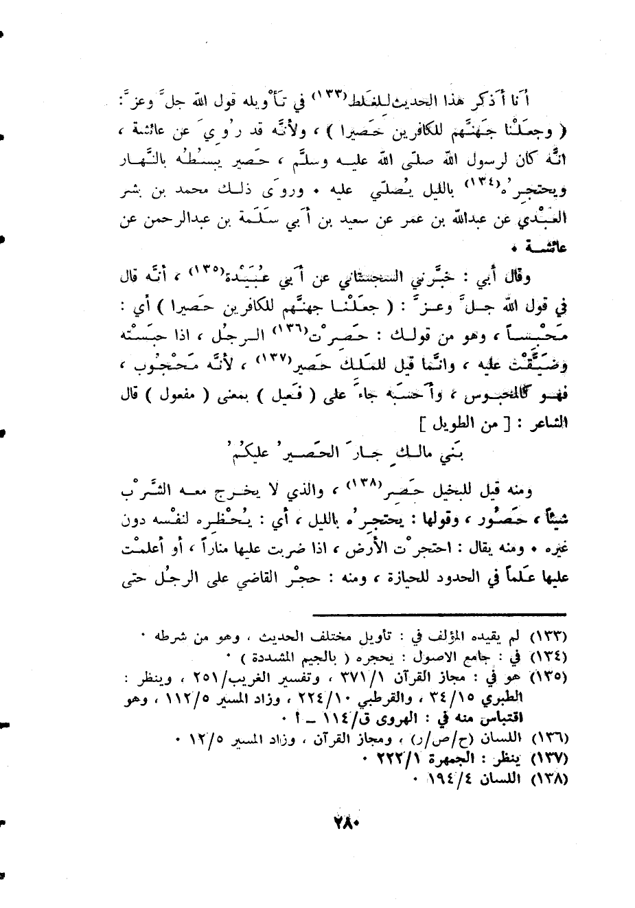 وَقَالَ أبي خبرني السجسْتانِي عَن أبي عُبَيْدَة أَنه قَالَ فِي قَول الله جلّ وَعز {وَجَعَلنَا جَهَنَّم للْكَافِرِينَ حَصِيرا} أَي محبسا وَهُوَ من قَوْلك حصرت الرجل إِذا حَبسته وضيقت عَلَيْهِ وَإِنَّمَا قيل للْملك حَصِير لأنن مَحْجُوب فَهُوَ كالمحبوس وَأَحْسبهُ جَاءَ على فعيل بِمَعْنى مفعول قَالَ الشَّاعِر من الطَّوِيل ... بني مَالك جَار الْحَصِير عَلَيْكُم ...
