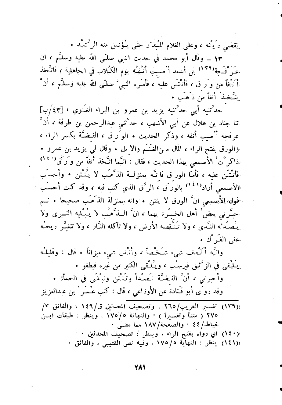 حَدَّثَنِيهِ أبي حَدَّثَنِيهِ يزِيد بن عَمْرو بن الْبَراء الغنوي [43 / ب] ثَنَا جناد بن هِلَال عَن ابي الْأَشْهب حَدثنِي عبد الرحمن بن طرفَة أَن عرْفجَة أُصِيب أَنفه وَذكر الحَدِيث الْوَرق الْفضة بِكَسْر الرَّاء وَالْوَرق بِفَتْح الرَّاء المَال من الْغنم وَالْإِبِل وَقَالَ لي يزِيد بن عَمْرو ذاكرت الْأَصْمَعِي بِهَذَا الحَدِيث فَقَالَ إِنَّمَا أَتَّخِذ أنفًا من ورق فَأَنْتن عَلَيْهِ فَأَما الْوَرق فَإِنَّهُ بِمَنْزِلَة الذَّهَب لَا ينتن وأحسب الْأَصْمَعِي أَرَادَ بالورق الرّقّ الَّذِي كتب فِيهِ وَقد كنت أَحسب قَول الْأَصْمَعِي أَن الْوَرق لَا ينتن وَأَنه بِمَنْزِلَة الذَّهَب صَحِيحا ثمَّ خبرني بعض أهل الْخِبْرَة بهما أَن الذَّهَب لَا يبليه الثرى وَلَا يصدئه الندى وَلَا تنقصه الأَرْض وَلَا تَأْكُله النَّار وَلَا تَتَغَيَّر رِيحه على الفرك