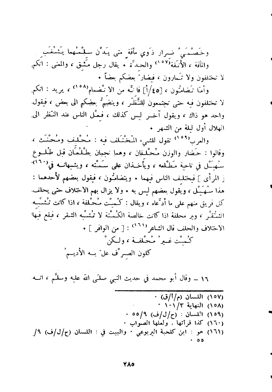 وَالْعرب تَقول للشَّيْء الْمُخْتَلف فِيهِ محلف ومحنث وَقَالُوا حضار وَالْوَزْن محلفان وهما نجمان يطلعان قبل طُلُوع سُهَيْل فِي نَاحيَة ة مطلعه ويأخذان على سمته ويشبهانه فِي المرأى فيختلف النَّاس فيهمَا ويتضامون فَيَقُول بَعضهم لأَحَدهمَا هَذَا سُهَيْل وَيَقُول بَعضهم لَيْسَ بِهِ وَلَا يزَال بهم الِاخْتِلَاف حَتَّى يحلف كل فريق مِنْهُم على مَا ادَّعَاهُ وَيُقَال كميت محلفة إِذا كَانَت تشبه الشقر وَغير محلفة إِذا كَانَت خَالِصَة الكمتة لَا تشبه الشقر فَيَقَع فِيهَا الِاخْتِلَاف وَالْحلف قَالَ الشَّاعِر [من الوافر] ... كميت غير محلفة وَلَكِن ... كلون الصّرْف عل بِهِ الْأَدِيم ...