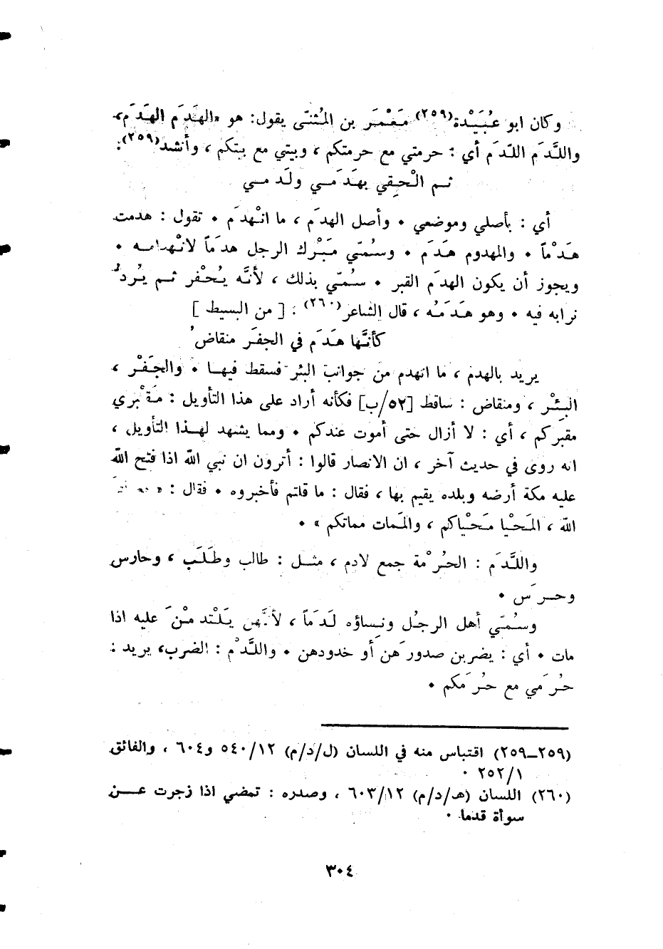 وَكَانَ أَبُو عُبَيْدَة معمر بن الْمثنى يَقُول هُوَ الْهدم الْهدم واللدم اللدم أَي حرمتي مَعَ حرمتكم وبيتي مَعَ بَيتكُمْ وَأنْشد ... ثمَّ الحقي بهدمي ولدمي ...