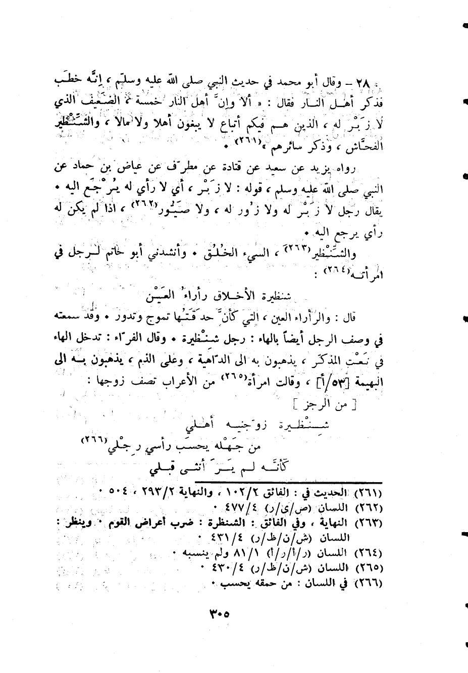 والشنظير السيء الْخلق وأنشدني أَبُو حَاتِم لرجل فِي امْرَأَته ... شنظيرة الْأَخْلَاق رأراء الْعين ...