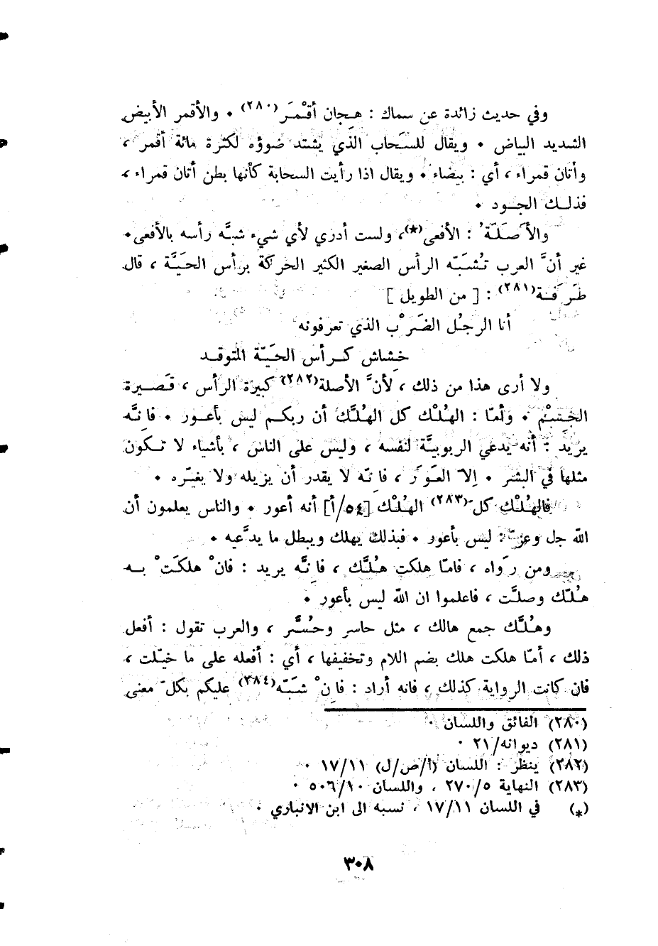 والأصلة الأفعى وَلست أَدْرِي لأي شَيْء شبه رَأسه بالأفعى غير أَن الْعَرَب تشبه الرَّأْس الصَّغِير الْكثير الْحَرَكَة بِرَأْس الْحَيَّة قَالَ طرفَة من الطَّوِيل ... أَنا الرجل الضَّرْب الَّذِي تعرفونه ... خشَاش كرأس الْحَيَّة المتوقد ...