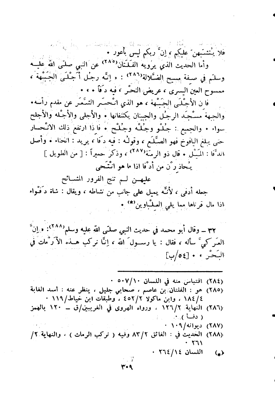 وَأما الحَدِيث الَّذِي يرويهِ الفلتان عَن النَّبِي صلى الله عَلَيْهِ وَسلم فِي صفة مسيح الضَّلَالَة إِنَّه رجل أجلى الْجَبْهَة مَمْسُوح الْعين الْيُسْرَى عريض النَّحْر فِيهِ دفأ