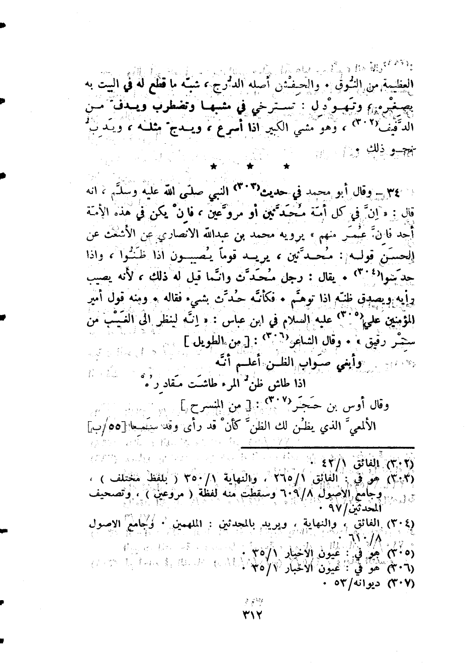 34 - وَقَالَ أَبُو مُحَمَّد فِي حَدِيث النَّبِي صلى الله عَلَيْهِ وَسلم أَنه قَالَ إِن فِي كل أمة محدثين أَو مروعين فَإِن يكن فِي هَذِه الْأمة أحد فَإِن عمر مِنْهُم يرويهِ مُحَمَّد بن عبد الله الْأنْصَارِيّ عَن الْأَشْعَث عَن الْحسن قَوْله محدثين يُرِيد قوما يصيبون إِذا ظنُّوا وَإِذا حدسوا يُقَال رجل مُحدث وَإِنَّمَا قيل لَهُ ذَلِك لِأَنَّهُ يُصِيب رَأْيه وَيصدق ظَنّه إِذا توهم فَكَأَنَّهُ حدث بِشَيْء فقاله وَمِنْه قَول أَمِير الْمُؤمنِينَ عَليّ عَلَيْهِ السَّلَام فِي ابْن عَبَّاس إِنَّه لينْظر إِلَى الْغَيْب من ستر رَقِيق وَقَالَ الشَّاعِر [من الطَّوِيل] ... وأبغي صَوَاب الظَّن أعلم أَنه ... إِذا طاش ظن الْمَرْء طاشت مقادره ...