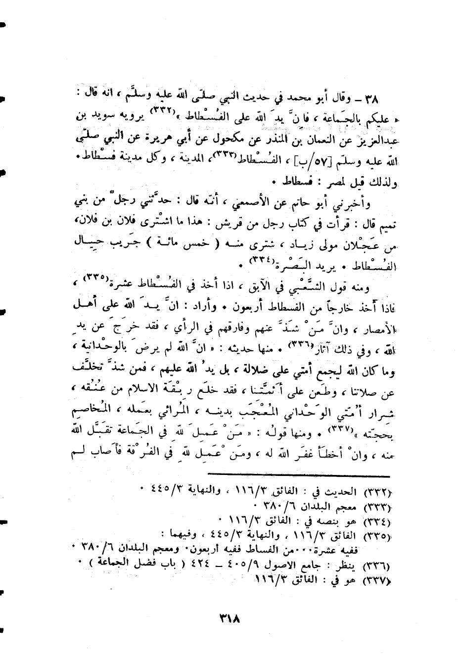 39 - وَقَالَ أَبُو مُحَمَّد فِي حَدِيث النَّبِي صلى الله عَلَيْهِ وَسلم انه قَالَ عَلَيْكُم بِالْجَمَاعَة فان يَد الله على الْفسْطَاط يرويهِ سُوَيْد بن عبد الْعَزِيز عَن النُّعْمَان بن الْمُنْذر عَن مَكْحُول عَن أبي هُرَيْرَة عَن النَّبِي صلى الله عَلَيْهِ وَسلم الْفسْطَاط الْمَدِينَة وكل مَدِينَة فسطاط وَلذَلِك قيل لمصر فسطاط.