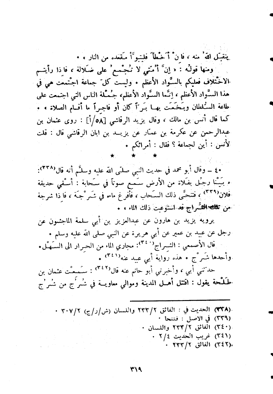 وَمِنْهَا قَوْله ان أمتِي لَا تجمع على ضَلَالَة فاذا رَأَيْتُمْ الِاخْتِلَاف فَعَلَيْكُم بِالسَّوَادِ الْأَعْظَم وَلَيْسَت كل جمَاعَة اجْتمعت هِيَ فِي هَذَا السوَاد الْأَعْظَم انما السوَاد الْأَعْظَم جملَة النَّاس الَّتِي اجْتمعت على طَاعَة السُّلْطَان وبخعت بهَا برا كَانَ أَو فَاجِرًا مَا أَقَامَ الصَّلَاة كَمَا قَالَ أنس بن مَالك وَقَالَ يزِيد الرقاشِي روى عُثْمَان بن عبد الرَّحْمَن عَن عِكْرِمَة بن عمار عَن يزِيد بن ابان الرقاشِي قَالَ قلت لأنس أَيْن الْجَمَاعَة فَقَالَ أمرائكم.