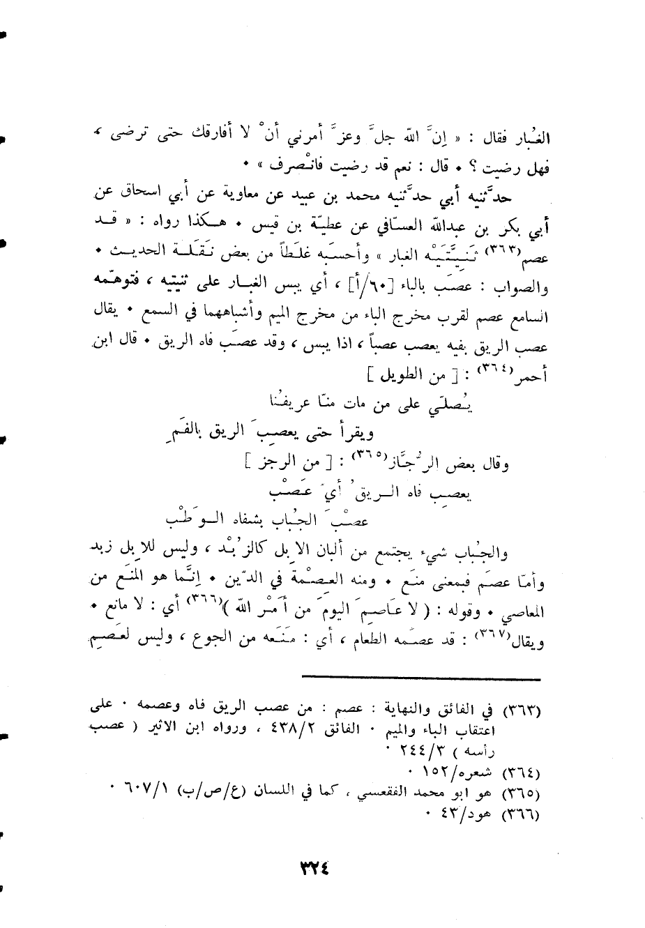 حَدَّثَنِيهِ أبي حَدَّثَنِيهِ مُحَمَّد بن عبيد عَن مُعَاوِيَة عَن أبي إِسْحَاق عَن أبي بكر بن عبد الله العسافي عَن عَطِيَّة بن قيس هَكَذَا رَوَاهُ قد عصم ثنيتيه الْغُبَار وَأَحْسبهُ غَلطا من بعض نقلة الحَدِيث وَالصَّوَاب عصب بِالْبَاء [60 / أ] أَي يبس الْغُبَار على ثنيتيه فتوهمه السَّامع عصم لقرب مخرج الْبَاء من مخرج الْمِيم وأشباههما فِي السّمع يُقَال عصب الرِّيق بِفِيهِ يعصب عصبا إِذا يبس وَقد عصب فَاه الرِّيق قَالَ ابْن أَحْمَر من الطَّوِيل ... يُصَلِّي على من مَاتَ منا عريفنا ... وَيقْرَأ حَتَّى يعصب الرِّيق بالفم ...