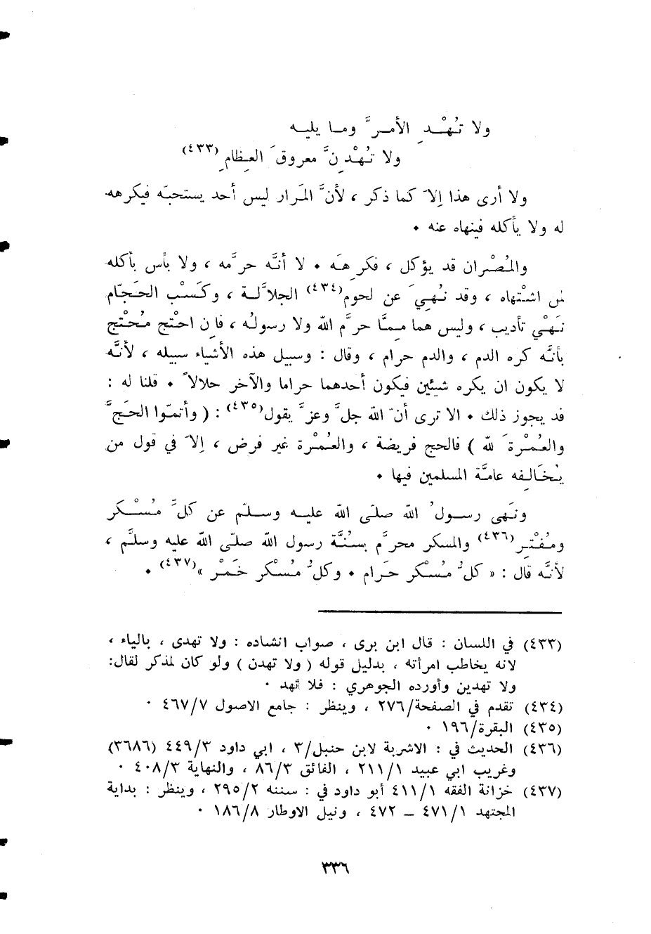 والمصران قد يُؤْكَل فكرهه لَا أَنه حرمه وَلَا بَأْس بِأَكْلِهِ لمن اشتهاه وَقد نهي عَن لُحُوم الْجَلالَة وَكسب الْحجام نهي تَأْدِيب وَلَيْسَ هما مِمَّا حرم الله وَلَا رَسُوله فان احْتج مُحْتَج بِأَنَّهُ كره الدَّم وَالدَّم حرَام وَقَالَ وسبيل هَذِه الْأَشْيَاء سَبيله لِأَنَّهُ لَا يكون أَن يكره شَيْئَيْنِ فَيكون أَحدهمَا حَرَامًا وَالْآخر حَلَالا قُلْنَا لَهُ قد يجوز ذَلِك الا ترى أَن الله جلّ وَعز يَقُول: {وَأَتمُّوا الْحَج وَالْعمْرَة لله} فالحج فَرِيضَة وَالْعمْرَة غير فرض الا فِي قَول من يُخَالِفهُ عَامَّة الْمُسلمين فِيهَا.
