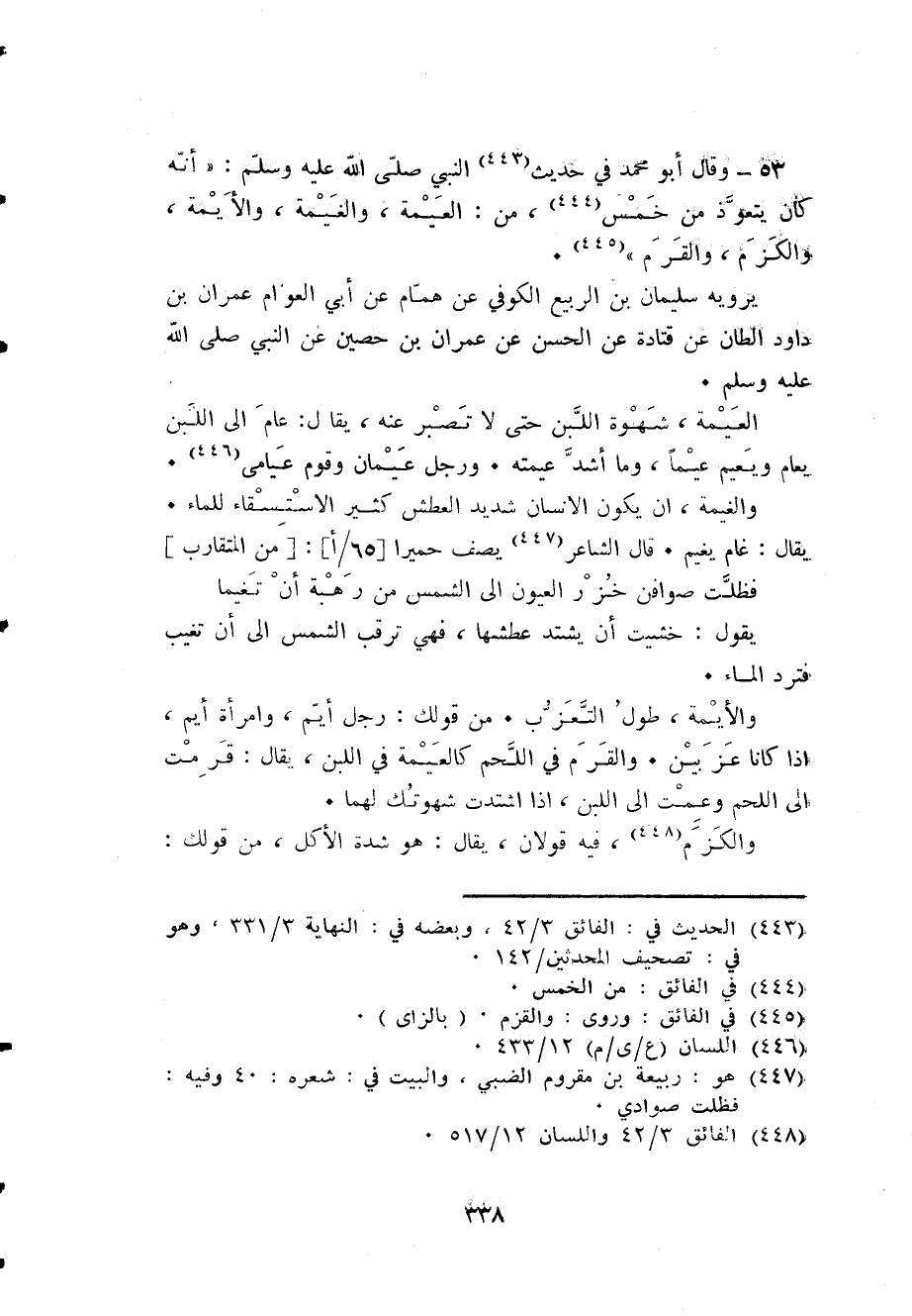53 - وَقَالَ أَبُو مُحَمَّد فِي حَدِيث النَّبِي صلى الله عَلَيْهِ وَسلم: أَنه كَانَ يتَعَوَّذ من خمس من العيمة والغيمة وَالْأَيمَة والكزم وَالْقَرْمُ.