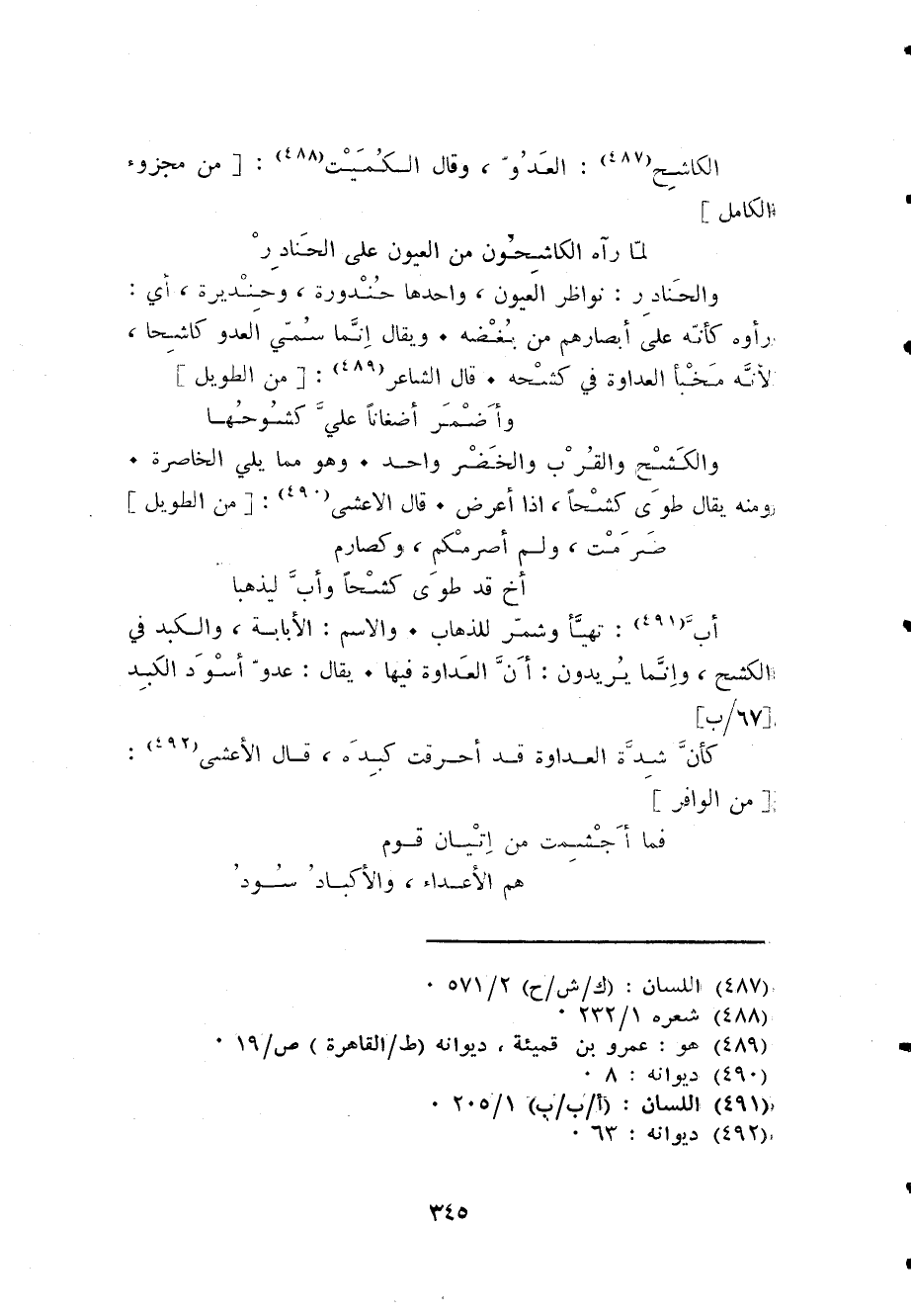 الْكَاشِح الْعَدو وَقَالَ الْكُمَيْت [من مجزوء الْكَامِل] ... لما رَآهُ الكاشحون من الْعُيُون على الحنادر ...