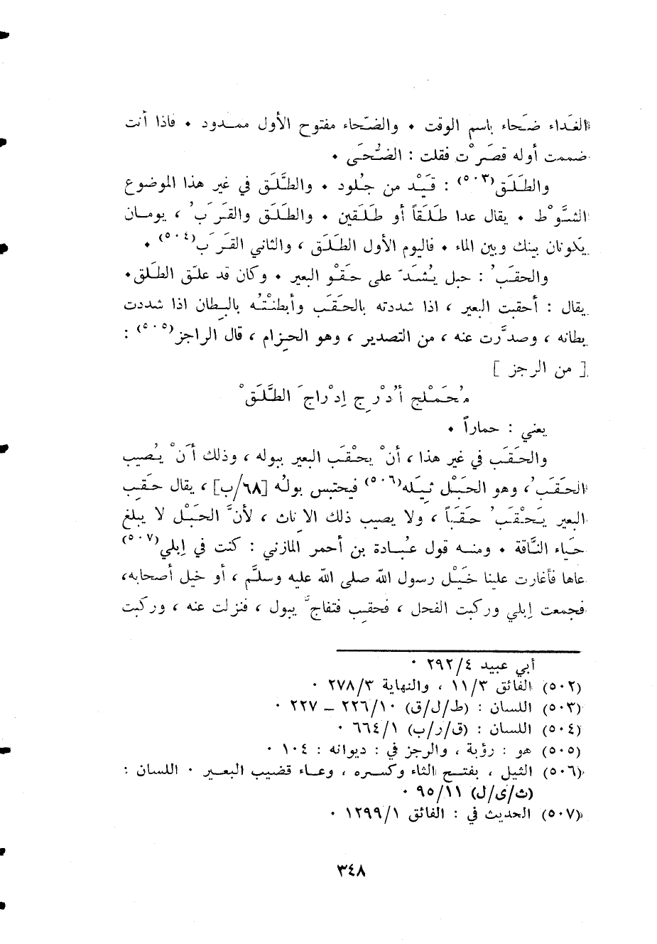 والحقب فِي غير هَذَا أَن يحقب الْبَعِير ببوله وَذَلِكَ أَن يُصِيب الحقب وَهُوَ الْحَبل ثيله فيحتبس بَوْله يُقَال حقب الْبَعِير يحقب حقبا وَلَا يُصِيب ذَلِك الْإِنَاث لِأَن الْحَبل لَا يبلغ حَيَاء النَّاقة وَمِنْه قَول عبَادَة بن أَحْمَر الْمَازِني كنت فِي إبلي عاها فأغارت علينا خيل رَسُول الله صلى الله عَلَيْهِ وَسلم أَو خيل أَصْحَابه فَجمعت إبلي وَركبت الْفَحْل فحقب فتفاج يَبُول فَنزلت عَنهُ وَركبت