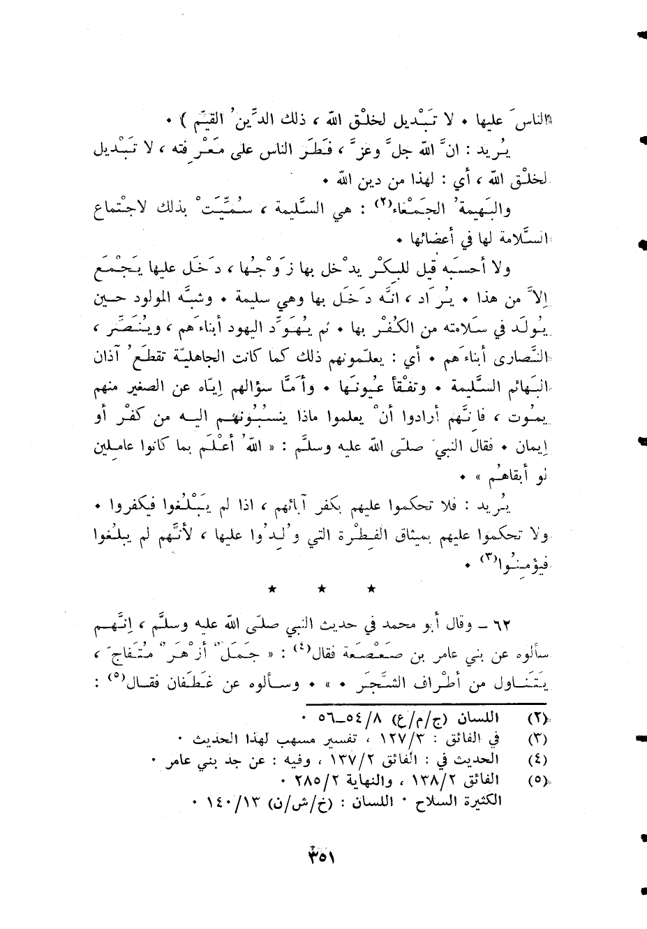 وَلَا أَحْسبهُ قيل للبكر يدْخل بهَا زَوجهَا دخل عَلَيْهَا يجمع إِلَّا من هَذَا يُرَاد أَنه دخل بهَا وَهِي سليمَة وَشبه الْمَوْلُود حِين يُولد فِي سَلَامَته من الْكفْر بهَا ثمَّ يهود الْيَهُود أَبْنَاءَهُم وينصر النَّصَارَى أَبْنَاءَهُم أَي يعلمونهم ذَلِك كَمَا كَانَت الْجَاهِلِيَّة تقطع آذان الْبَهَائِم السليمة وتفقأ عيونها وَأما سُؤَالهمْ إِيَّاه عَن الصَّغِير مِنْهُم يَمُوت فَإِنَّهُم أَرَادوا أَن يعلمُوا مَاذَا ينسبونهم إِلَيْهِ من كفر أَو إِيمَان فَقَالَ النَّبِي صلى الله عَلَيْهِ وَسلم ألله أعلم بِمَا كَانُوا عاملين لَو أبقاهم