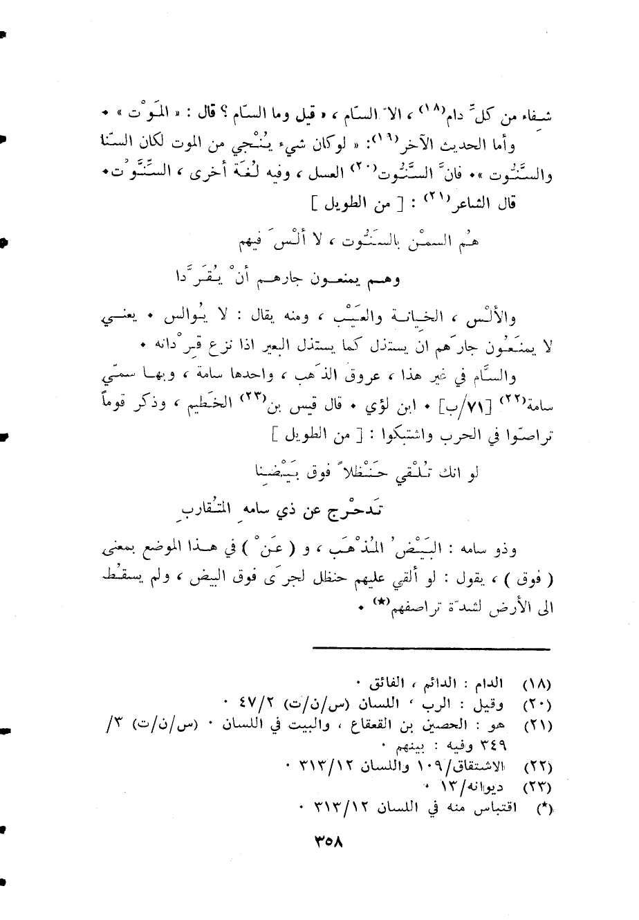 والسام فِي غير هَذَا عروق الذَّهَب وَاحِدهَا سامة وَبهَا سمي سامة ابْن لؤَي قَالَ قيس بن الخطيم وَذكر قوما تراصوا فِي الْحَرْب واشتبكوا [من الطَّوِيل] ... لَو أَنَّك تلقي حنظلا فَوق بيضنا ... تدحرج عَن ذِي سامه المتقارب ...