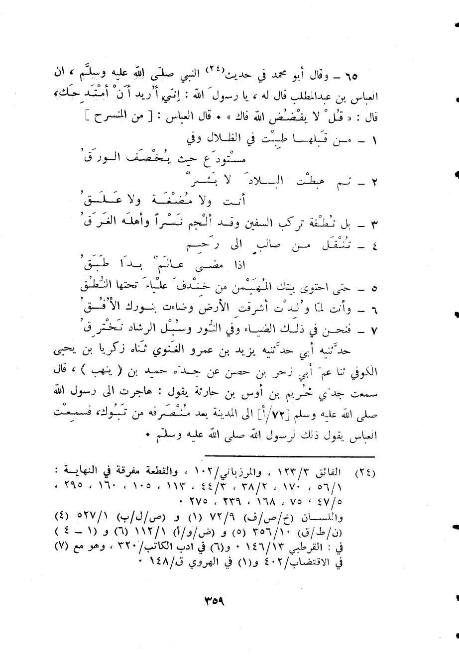 65 - وَقَالَ أَبُو مُحَمَّد فِي حَدِيث النَّبِي صلى الله عَلَيْهِ وَسلم أَن الْعَبَّاس بن عبد المطلب قَالَ لَهُ يَا رَسُول الله إِنِّي أُرِيد أَن أمتدحك قَالَ قل لَا يفضض الله فَاك قَالَ الْعَبَّاس [من المنسرح] ... 1 - من قبلهَا طبت فِي الظلال وَفِي ... مستودع حَيْثُ يخصف الْوَرق