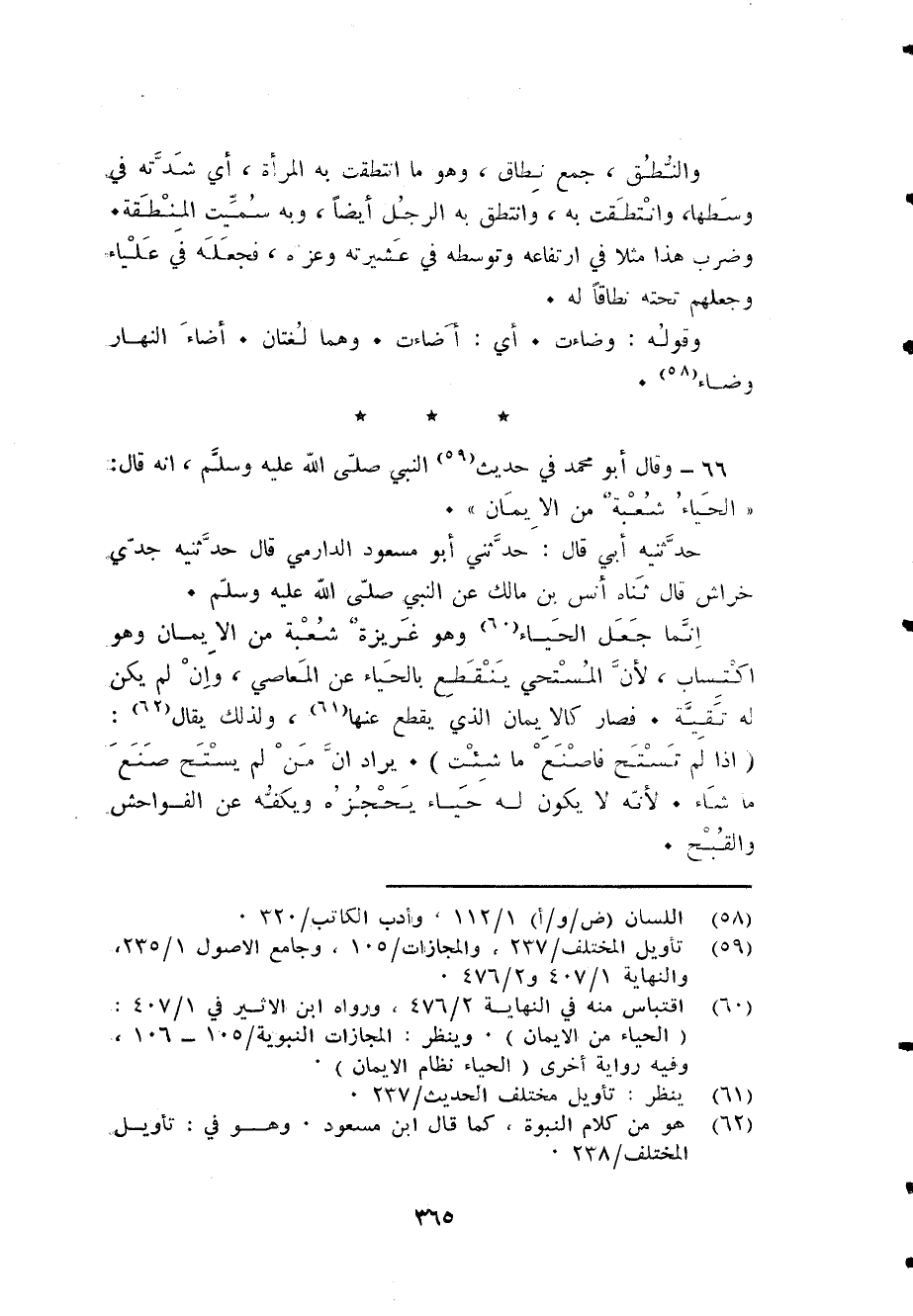 66 - وَقَالَ أَبُو مُحَمَّد فِي حَدِيث النَّبِي صلى الله عَلَيْهِ وَسلم أَنه قَالَ الْحيَاء شُعْبَة من الْإِيمَان