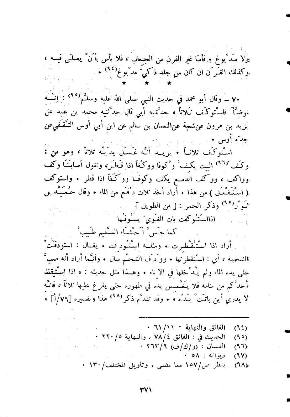 استوكف ثَلَاثًا يُرِيد أَنه غسل يَدَيْهِ ثَلَاثًا وَهُوَ من وكف الْبَيْت يكف وكوفا ووكفا إِذا قطر وَتقول أَصَابَنَا وكف وواكف ووكف الدمع يكف وكوفا ووكفا إِذا قطر واستوكف استفعل من هَذَا أَرَادَ أَخذ ثَلَاث دفع من المَاء وَقَالَ حميد بن ثَوْر وَذكر الْحمر [من الطَّوِيل] ... إِذا استوكفت بَات الغوي يسوفها ... كَمَا جس أحشاء السقيم طَبِيب ...