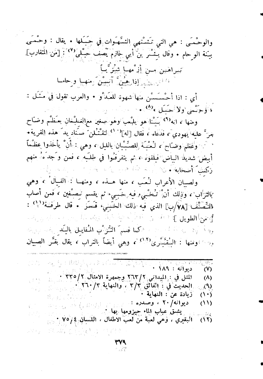 ولصبيان الْأَعْرَاب لعب مِنْهَا هَذِه وَمِنْهَا الفيال وَهِي بِالتُّرَابِ وَذَلِكَ أَن تخبئ فِيهِ خبيء ثمَّ يقسم نِصْفَيْنِ فَمن أصَاب النّصْف الَّذِي فِيهِ ذَلِك الخبيء قمر قَالَ طرفَة [من الطَّوِيل] ... كَمَا قسم الترب المفايل بِالْيَدِ ...