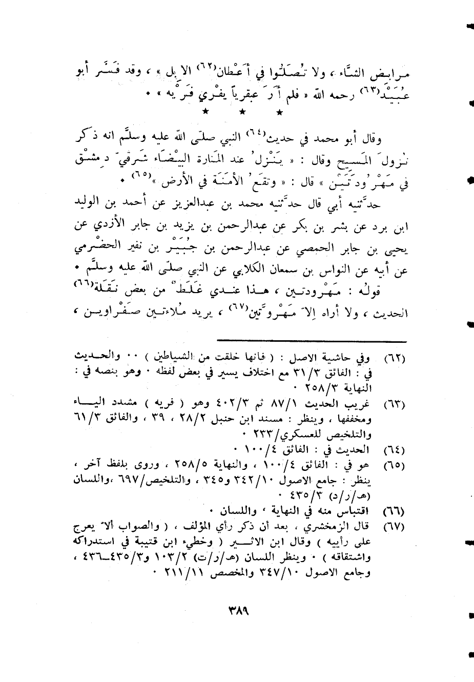 وَقَالَ أَبُو مُحَمَّد فِي حَدِيث النَّبِي صلى الله عَلَيْهِ وَسلم أَنه ذكر نزُول الْمَسِيح وَقَالَ ينزل عِنْد المنارة الْبَيْضَاء شَرْقي دمشق فِي مهرودتين قَالَ وَتَقَع الأمنة فِي الأَرْض