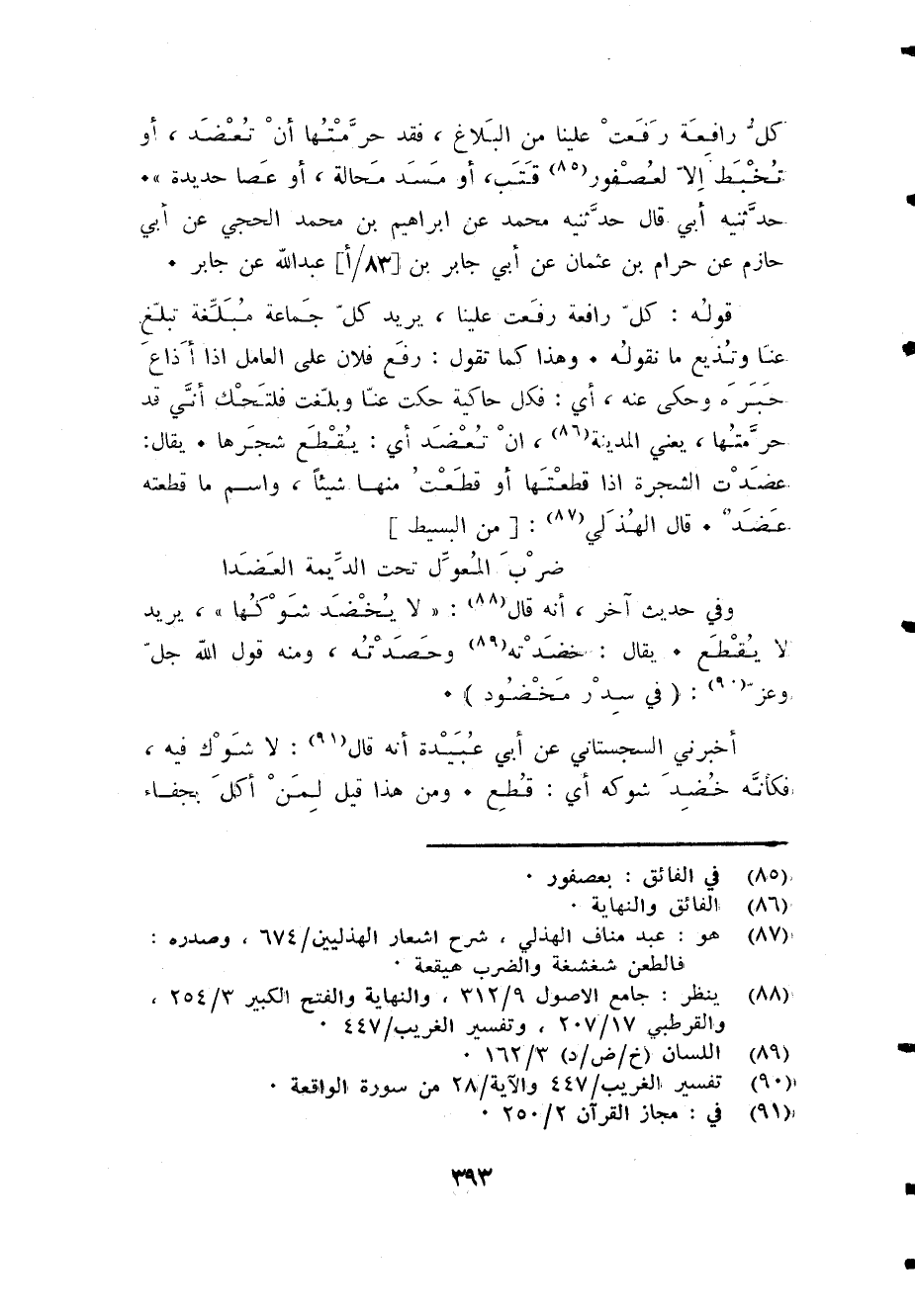 كل رَافِعَة رفعت علينا من الْبَلَاغ فقد حرمتهَا أَن تعضد أَو تخبط إِلَّا لعصفور قتب أَو مسد محَالة أَو عَصا حَدِيدَة حَدَّثَنِيهِ أبي قَالَ حَدَّثَنِيهِ مُحَمَّد عَن إِبْرَاهِيم بن مُحَمَّد الحجي عَن أبي حَازِم عَن حرَام بن عُثْمَان عَن ابي جَابر بن [83 / أ] عبد الله عَن جَابر