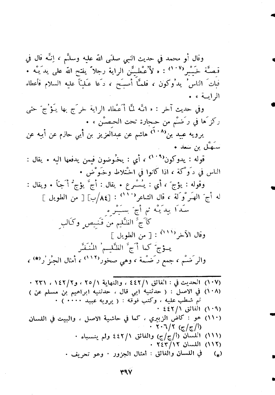 وَقَوله يؤج أَي يسْرع يُقَال أج يؤج أجا وَيُقَال لَهُ أج الهرولة قَالَ الشَّاعِر [من الطَّوِيل] ... سدا بيدَيْهِ ثمَّ أج بسيره ... كأج الظليم من قنيص وكالب ...