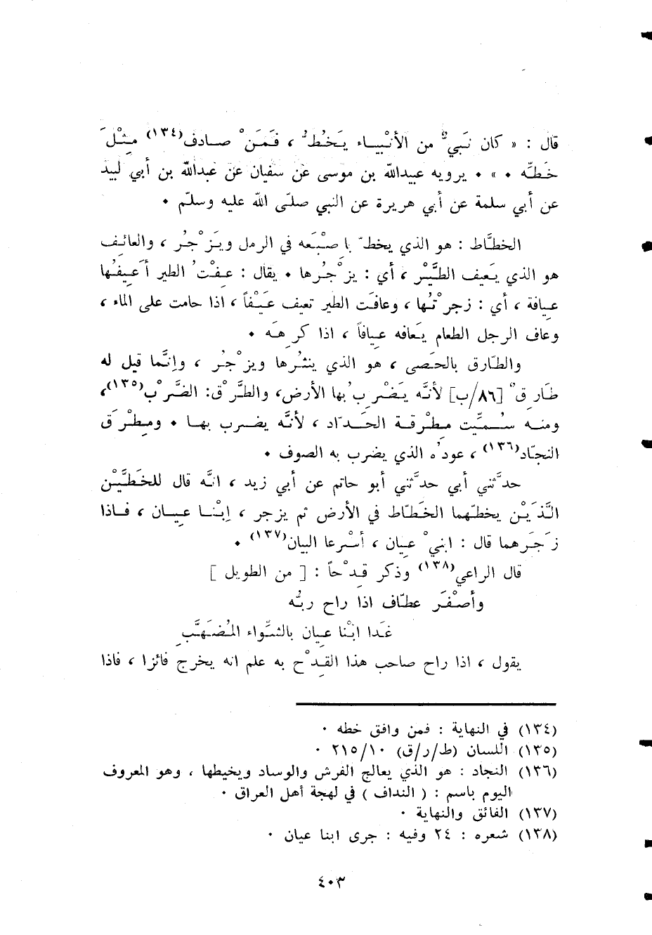 حَدثنِي أبي حَدثنِي أَبُو حَاتِم عَن أبي زيد أَنه قَالَ للخطين الَّذين يخطهما الخطاط فِي الأَرْض ثمَّ يزْجر إبنا عيان فَإِذا زجرهما قَالَ ابْني عيان أَسْرعَا الْبَيَان