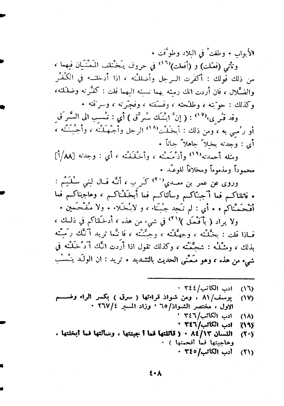 وَتَأْتِي فعلت أفعلت فِي حرفو يخْتَلف المعنيان فيهمَا من ذَلِك قَوْلك أكفرت الرجل وأضللتته إِذا أدخلته فِي الْكفْر والضلال فَإِن أردْت أَنَّك رميته بهما نسبته إِلَيْهِمَا قلت كفرته وضللته وَكَذَلِكَ حوبته وطلحته وفسقته وفجرته وسرقته