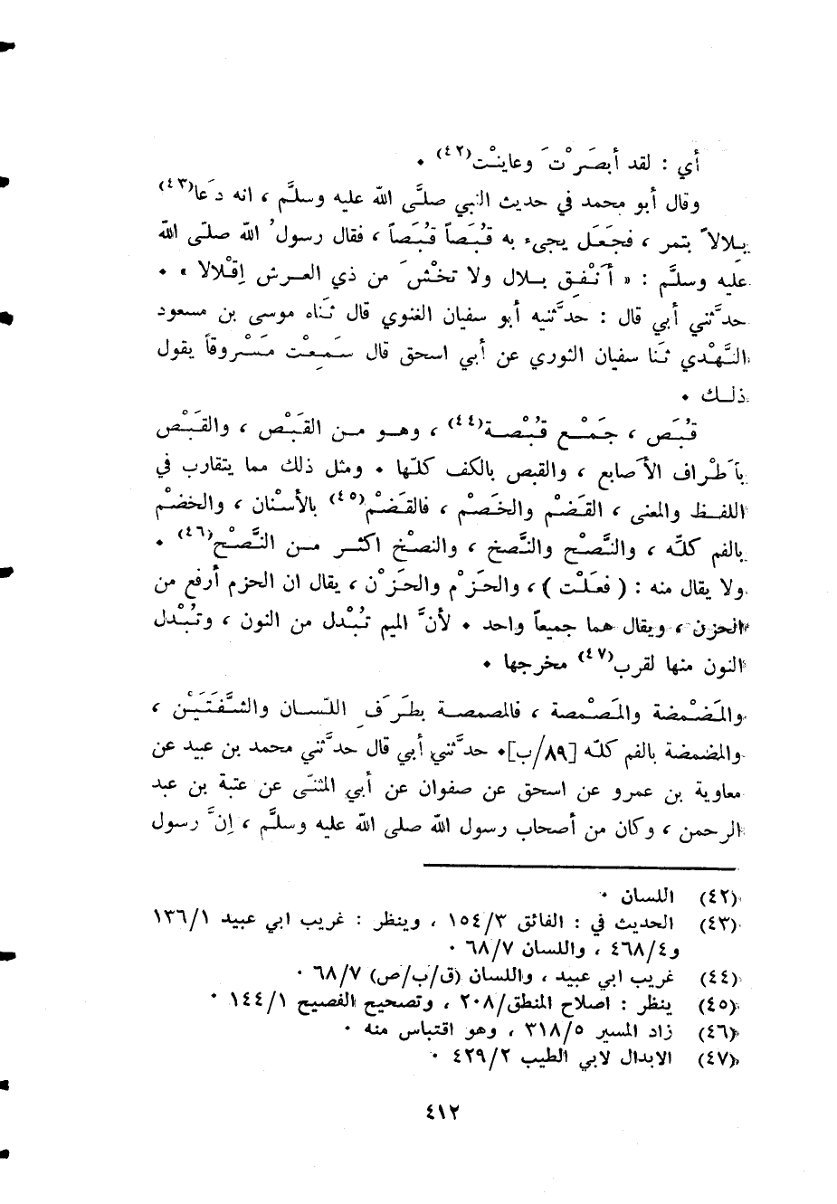 قبص جمع قبصة وَهُوَ من القبص والقبص بأطراف الْأَصَابِع والقبص بالكف كلهَا وَمثل ذَلِك مِمَّا يتقارب فِي اللَّفْظ وَالْمعْنَى القضم والخصم فالقضم بالأسنان والخضم بالفم كُله والنصح والنصخ والنصخ أَكثر من النصح وَلَا يُقَال مِنْهُ فعلت والحزم والحزن يُقَال إِن الحزم أرفع من الْحزن وَيُقَال هما جَمِيعًا وَاحِد لِأَن الْمِيم تبدل من النُّون وتبدل النُّون مِنْهَا لقرب مخرجها