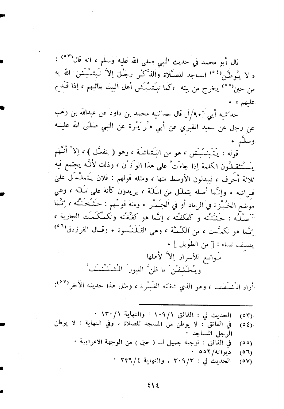 قَوْله يتبشبش هُوَ من البشاشة وَهُوَ يتفعل إِلَّا أَنهم يستثقلون الْكَلِمَة إِذا جَاءَت على هَذَا الْوَزْن وَذَلِكَ لِأَنَّهُ يجْتَمع فِيهِ ثَلَاثَة أحرف فيبدلون الْأَوْسَط مِنْهَا وَمثله قَوْلهم فلَان يتململ على فرَاشه وَإِنَّمَا أَصله يتملل من الْملَّة يُرِيدُونَ كَأَنَّهُ على مِلَّة وَهِي مَوضِع الخبزة فِي الرماد أَو فِي الْجَمْر وَمِنْه قَوْلهم حثحثته إِنَّمَا أَصله حثثته وكفكفته إِنَّمَا هُوَ كففته وتكمكمت الْجَارِيَة إِنَّمَا هُوَ تكممت من الكمة وَهِي القلنسوة وَقَالَ الفرزدق يصف نسَاء [من الطَّوِيل] ... مَوَانِع للأسرار إِلَّا لأَهْلهَا ... ويخلفن مَا ظن الغيور المشفشف ...