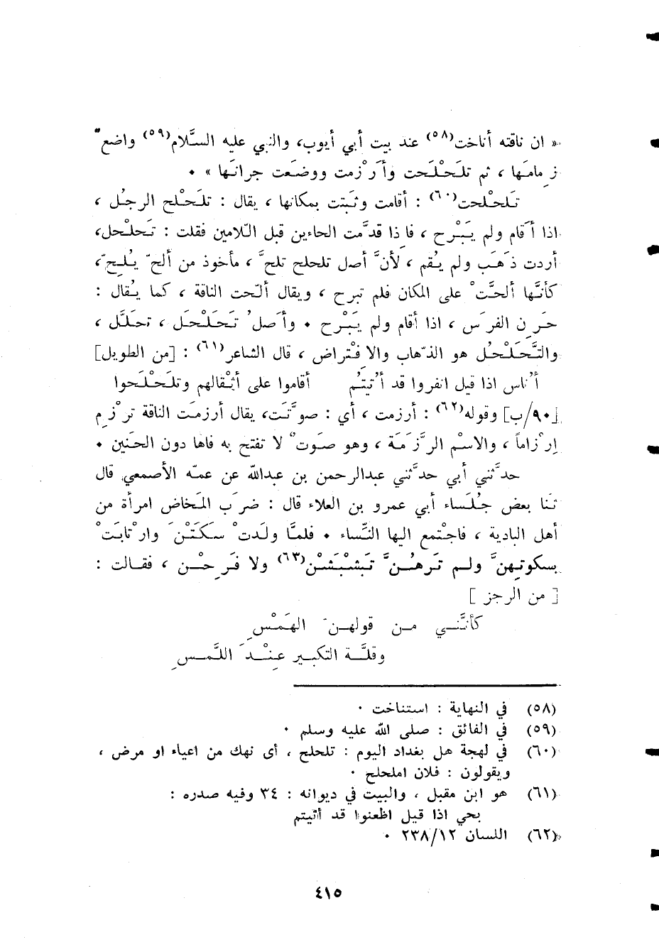 حَدثنِي أبي حَدَّثَنى عبد الرحمن بن عبد الله عَن عَمه الْأَصْمَعِي قَالَ ثَنَا بعض جلساء أبي عَمْرو بن الْعَلَاء قَالَ ضرب الْمَخَاض امْرَأَة من أهل الْبَادِيَة فَاجْتمع إِلَيْهَا النِّسَاء فَلَمَّا ولدت سكتن وارتابت بسكوتهن وَلم ترهن تبشبشن وَلَا فرحن فَقَالَت [من الرجز] ... كأنني من قولهن الهمس ... وَقلة التَّكْبِير عِنْد اللَّمْس ...