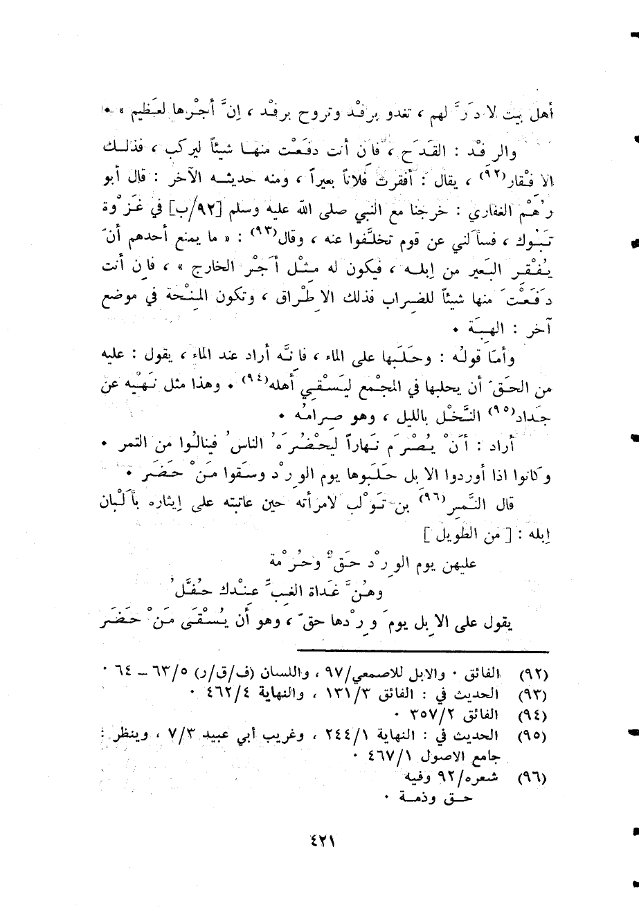 قَالَ النمر بن تولب لامْرَأَته حِين عاتبته على إيثاره بألبان إبِله [من الطَّوِيل] ... عَلَيْهِنَّ يَوْم الْورْد حق وَحُرْمَة ... وَهن غَدَاة الغب عنْدك حفل ...