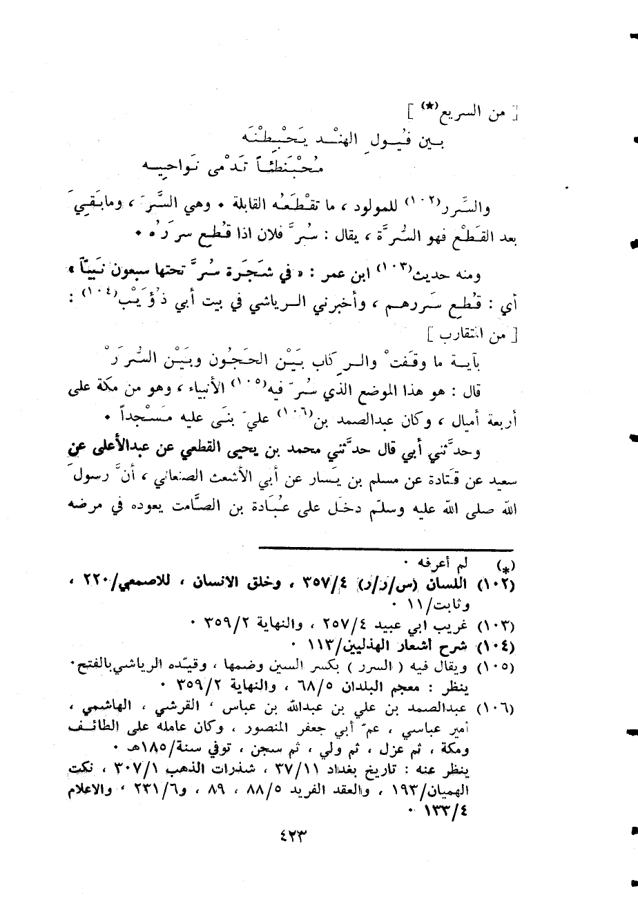 وَمِنْه حَدِيث ابْن عمر فِي شَجَرَة سر تحتهَا سَبْعُونَ نَبيا أَي قطع سررهم وَأَخْبرنِي الرياشي فِي بَيت أبي ذُؤَيْب [من المتقارب] ... بِآيَة مَا وقفت والركاب بَين الْحجُون وَبَين السرر ...