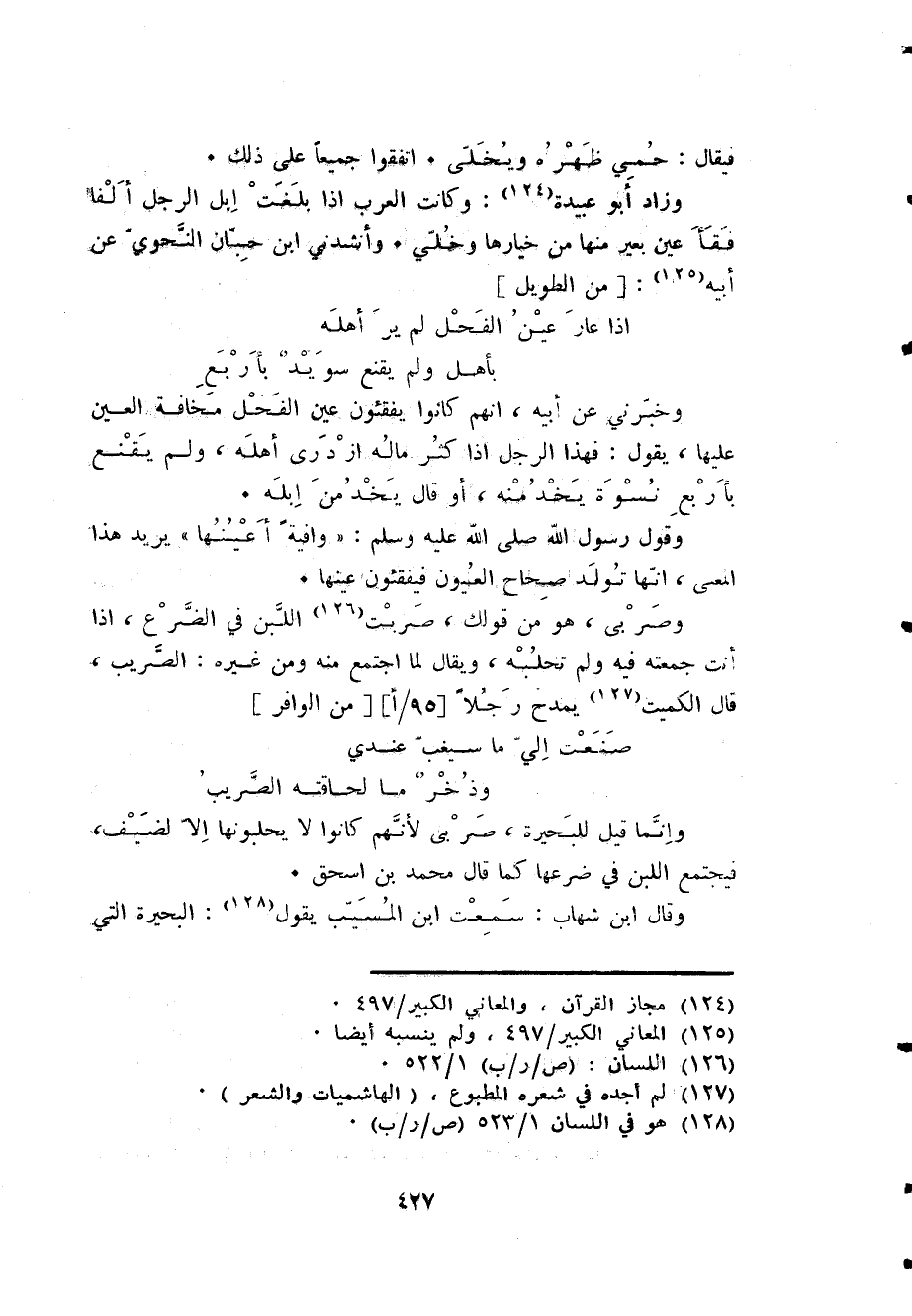 وَزَاد أَبُو عُبَيْدَة وَكَانَت الْعَرَب إِذا بلغت إبل الرجل ألفا فَقَأَ عين بعير مِنْهَا من خِيَارهَا وخلي وأنشدني ابْن حبَان النَّحْوِيّ عَن أَبِيه [من الطَّوِيل] ... إِذا عَار عين الْفَحْل لم ير أَهله ... بِأَهْل وَلم يقنع سُوَيْد بِأَرْبَع ...