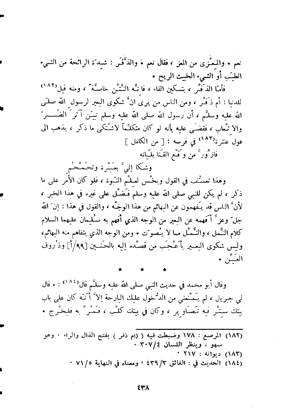 فَأَما الذفر بتسكين الْفَاء فَإِنَّهُ النتن خَاصَّة وَمِنْه قيل للدنيا أم ذفر وَمن النَّاس من يرى أَن شكوى الْبَعِير لرَسُول الله صلى الله عَلَيْهِ وَسلم أَن رَسُول الله صلى الله عَلَيْهِ وَسلم تبين أثر الضّر والإتعاب فَقضى عَلَيْهِ بِأَنَّهُ لَو كَانَ متكلما لاشتكى مَا ذكر يذهب إِلَى قَول عنترة فِي فرسه [من الْكَامِل] ... فازور من وَقع القنا بليانه ... وشكا إِلَيّ بعبرة وتحمحم ...