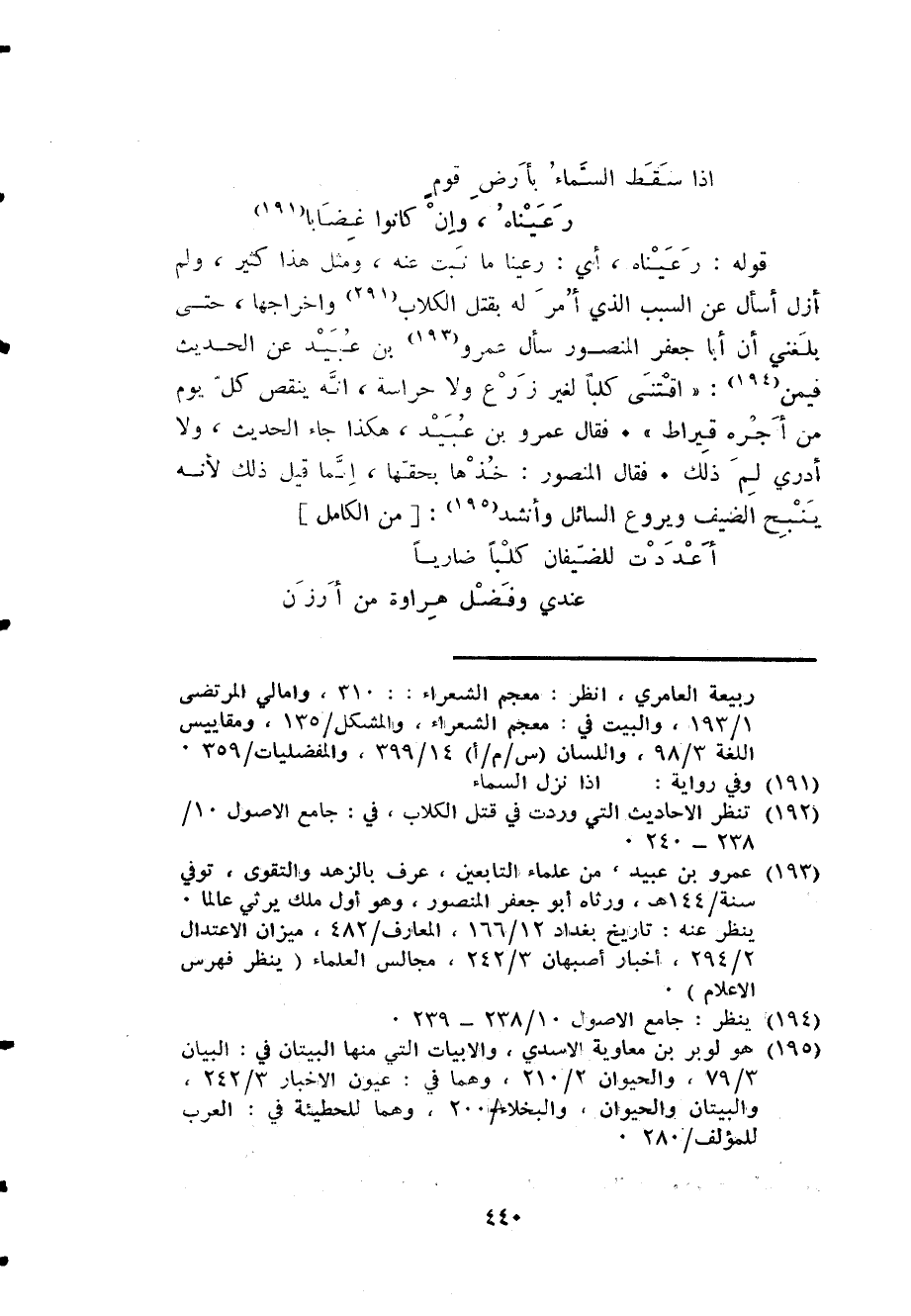 قَوْله رعيناه أَي رعينا مَا نبت عَنهُ وَمثل هَذَا كثير وَلم أزل أسأَل عَن السَّبَب الَّذِي أَمر لَهُ بقتل الْكلاب وإخراجها حَتَّى بَلغنِي أَن أَبَا جَعْفَر الْمَنْصُور سَأَلَ عَمْرو بن عبيد عَن الحَدِيث فِيمَن اقتنى كَلْبا لغير زرع وَلَا حراسة أَنه ينقص كل يَوْم من أجره قِيرَاط فَقَالَ عَمْرو بن عبيد هَكَذَا جَاءَ الحَدِيث وَلَا أَدْرِي لم ذَلِك فَقَالَ الْمَنْصُور خُذْهَا بِحَقِّهَا إِنَّمَا قيل ذَلِك لِأَنَّهُ ينبح الضَّيْف ويروع السَّائِل وَأنْشد [من الْكَامِل] ... أَعدَدْت للضيفان كَلْبا ضاريا ... عِنْدِي وَفضل هراوة من أرزن ...
