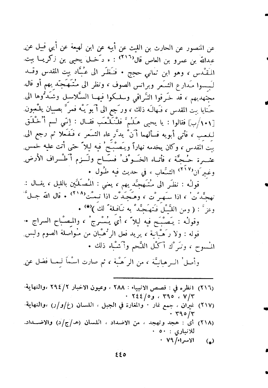 عَن الْمَنْصُور عَن الْحَارِث بن اللَّيْث عَن أَبِيه عَن ابْن لَهِيعَة عَن أبي قبيل عَن عبد الله بن عَمْرو بن الْعَاصِ قَالَ دخل يحيى بن زَكَرِيَّا بَيت الْمُقَدّس وَهُوَ ابْن ثَمَانِي حجج فَنظر إِلَى عباد بَيت الْمُقَدّس وَقد لبسوا مدارع الشّعْر وبرانس الصُّوف وَنظر إِلَى متهدديهم أَو قَالَ مجتهديهم قد خرقوا التراقي وسلكوا فِيهَا السلَاسِل وشدوها إِلَى حنايا بَيت الْمُقَدّس فهاله ذَلِك وَرجع إِلَى أَبَوَيْهِ فَمر بصبيان يَلْعَبُونَ فَقَالُوا يَا يحيى هَلُمَّ فلنلعب فَقَالَ إِنِّي لم أخلق للعب فَأتى أَبَوَيْهِ فَسَأَلَهُمَا أَن يدرعاه الشّعْر ففعلا ثمَّ رَجَعَ إِلَى بَيت الْمُقَدّس وَكَانَ يَخْدمه نَهَارا وَيُصْبِح فِيهِ لَيْلًا حَتَّى أَتَت عَلَيْهِ خمس عشرَة حجَّة فَأَتَاهُ الْخَوْف فساحا وَلزِمَ أَطْرَاف الأَرْض وغيران الشعاب فِي حَدِيث فِيهِ طول