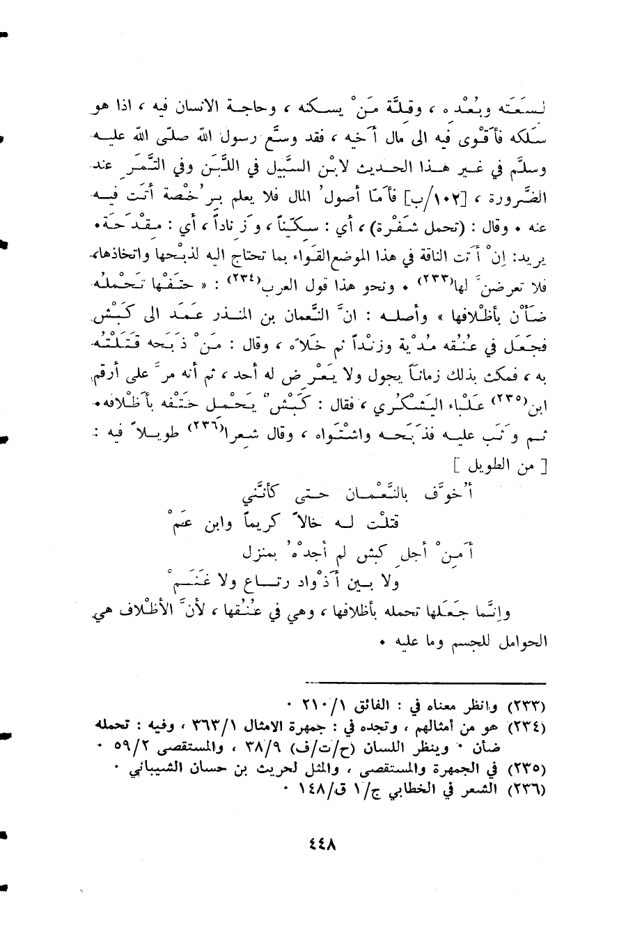 لسعته وَبعده وَقلة من يسكنهُ وحاجة الْإِنْسَان فِيهِ إِذا هُوَ سلكه فأقوى فِيهِ إِلَى مَال أَخِيه فقد وسع رَسُول الله صلى الله عَلَيْهِ وَسلم فِي غير هَذَا الحَدِيث لِابْنِ السَّبِيل فِي اللَّبن وَفِي التَّمْر عِنْد الضَّرُورَة فَأَما أصُول المَال فَلَا يعلم بِرُخْصَة أَتَت فِيهِ عَنهُ وَقَالَ تحمل شفرة أَي سكينا وزنادا أَي مقدحة يُرِيد إِن أَتَت النَّاقة فِي هَذَا الْموضع القواء بِمَا تحْتَاج إِلَيْهِ لذبحها واتخاذها فَلَا تعرضن لَهَا وَنَحْو هَذَا قَول الْعَرَب حتفها تحمله ضَأْن بأظلافها وَأَصله أَن النُّعْمَان بن الْمُنْذر عمد إِلَى كَبْش فَجعل فِي عُنُقه مدية وزندا ثمَّ خلاه وَقَالَ من ذبحه قتلته بِهِ فَمَكثَ بذلك زَمَانا يجول وَلَا يعرض لَهُ أحد ثمَّ أَنه مر على أَرقم ابْن علْبَاء الْيَشْكُرِي فَقَالَ كَبْش يحمل حتفه بأظلافه ثمَّ وثب عَلَيْهِ فذبحه واشتواه وَقَالَ شعرًا طَويلا فِيهِ [من الطَّوِيل] ... أخوف بالنعمان حَتَّى كأنني ... قتلت لَهُ خالا كَرِيمًا وَابْن عَم
