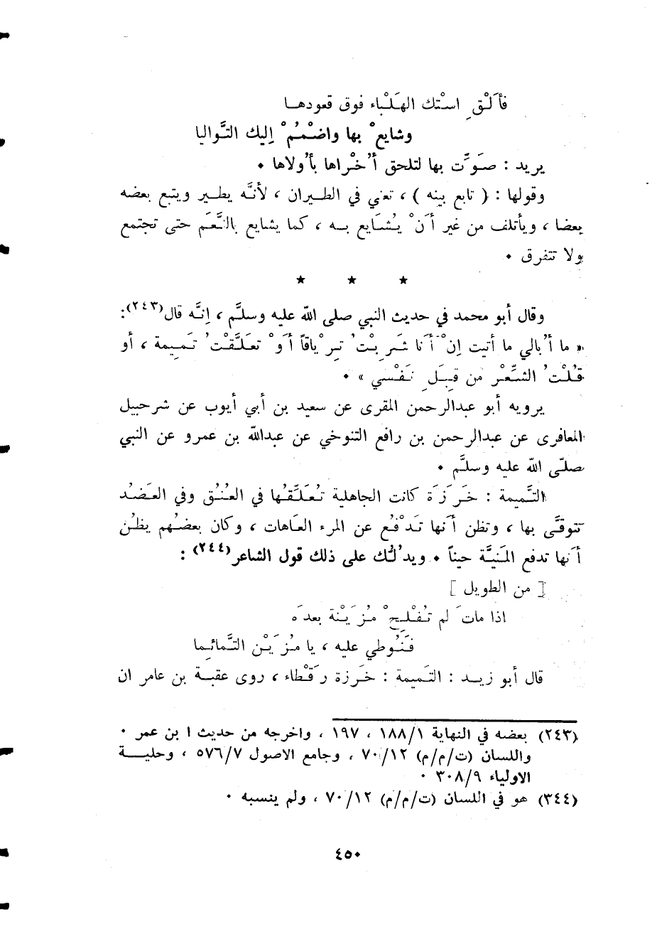 التميمة خرزة كَانَت الْجَاهِلِيَّة تعلقهَا فِي الْعُنُق وَفِي الْعَضُد تتوقى بهَا وتظن أَنَّهَا تدفع عَن الْمَرْء العاهات وَكَانَ بَعضهم يظنّ أَنَّهَا تدفع الْمنية حينا ويدلك على ذَلِك قَول الشَّاعِر [من الطَّوِيل] ... إِذا مَاتَ لم تفلح مزينة بعده ... فنوطي عَلَيْهِ يَا مزين التمائما ...